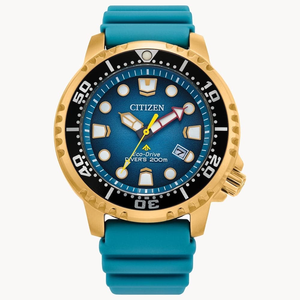 Explore the deepest depths with the latest Promaster Dive in a stylish new color. This must-have diving watch vibrantly features a gold-tone stainless steel case, a turquoise 3-hand dial with date function, and luminous hands and markers. The durable, matching turquoise polyurethane strap with buckle closure completes the look for a comfortable fit. Featuring our sustainable Eco-Drive technology powered by any light that never needs a battery, you’ll wear this high-performance timepiece in high style from adventures on land to the deep blue sea. ISO compliant and water resistant to 200 meters. Caliber E168.