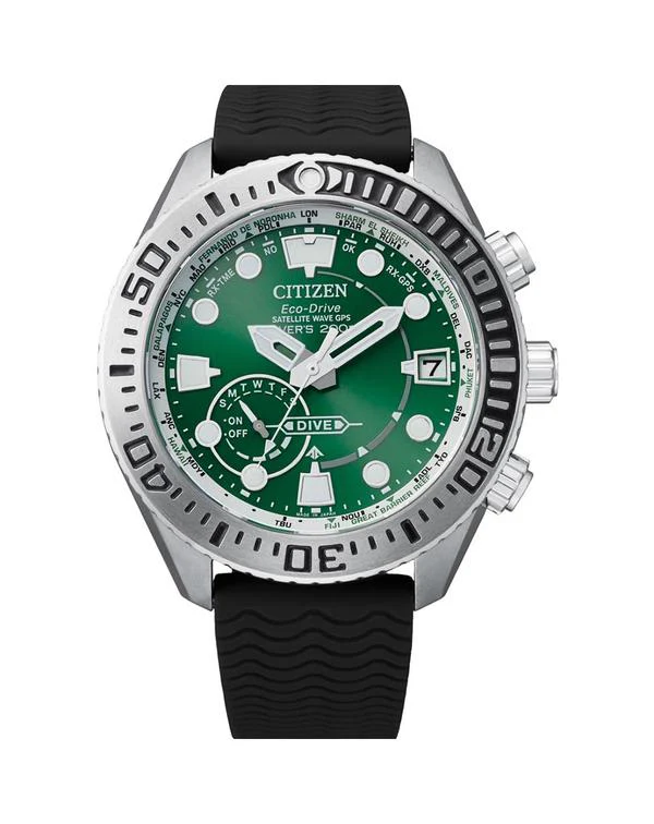 Ready, Set, Dive. Welcome the new addition to the Promaster Marine collection. Equipped with GPS timekeeping, ISO compliant, one way rotating elapsed time bezel and screw down crown. Take your next adventure to the limit with this stylishly emerald green dial and Super Titanium case. Super Titanium is 40% lighter than stainless steel and 5 times harder. Crafted with 8 world famous diving spots on the bezel, this watch will help you reach your next adventure. Featuring a date, sapphire glass and polyurethane strap. You dont want anything else when headed to the ocean. Powered by Eco-Drive technology, never needing a battery.