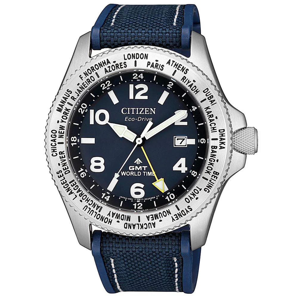 The Citizen Eco-Drive men’s watch is designed to be a classically designed piece that is functional and affordable. Classic, clean lines are common amongst men’s watches, and this model is no different. With a blue face and matching blue nylon band. Water resistant up to 200 Meters , this watch can be worn swimming or showering without fear of water damage. Featuring a GMT function which allows the user to have two different time zones on the watch.