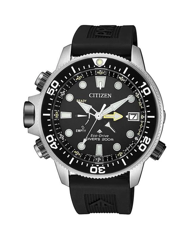 Engineered to take you deeper in style, this watch from the PROMASTER MARINE collection is water resistant to 200m, inviting you to explore the mysteries of the ocean while looking sharp at the same time. With an easy to read dial in a substantial 46.1mm stainless steel case, it also features depth meter, maximum depth memory display and a water-tight screw-lock crown. This robust combination of tough, hard-wearing elements has resulted in this timepiece being awarded ISO6425 diving certification, making it the ultimate accessory for your underwater adventures. Powered by any light source via Eco-Drive technology and storing enough energy to keep operating in complete darkness for 11 months, it never requires batteries. This reduces weight and, combined with the durable yet soft polyurethane strap, makes it simultaneously comfortable and strong enough to withstand the many rigours of aquatic exploration. With accuracy at a premium when you’re below the surface of the deep blue, it is exact to within 15 seconds over the course of an entire month, making it a showcase of stylish and dependable functionality.