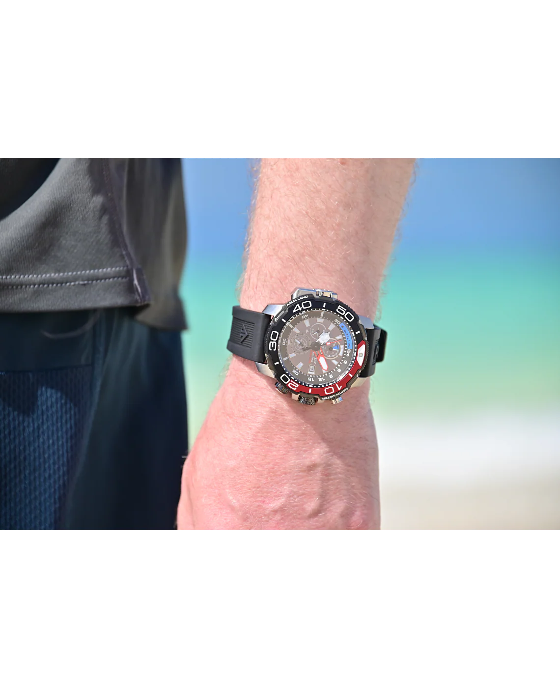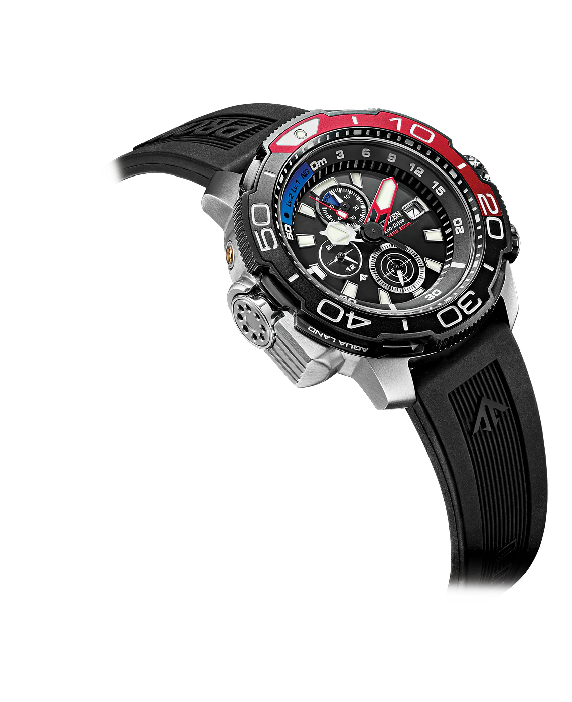Dependable precision, when you need it. Introducing the new Aqualand, the ProMaster Marine boasts extensive functionality necessitated by avid divers. Features such as an over-sized 50.4mm case and markings, luminous indexes, auto water sensor and power reserve indication with both chronograph and depth meter functions. A 1 second chronograph measures up to 50 minutes and depth display up to 50 meters with maximum depth memory. The ProMaster Marine is also ISO Diver compliant to diver’s 200M. This impressive functionality is echoed in the sporty appeal and durable construction. The robust stainless steel case design features a 3 layer bezel comprised of stainless steel, a durable diamond like coating and an aluminium ring. The crown is also stainless steel with a diamond like coating, the dial is black with a black polyurethane band. A colour pop of blue and red adds to the sporty aesthetic. The glass is scratch-resistant sapphire rounding out this steadfast, sturdy design. The ProMaster Marine is a win for men looking for a high performance underwater timepiece. Calibre B740.
