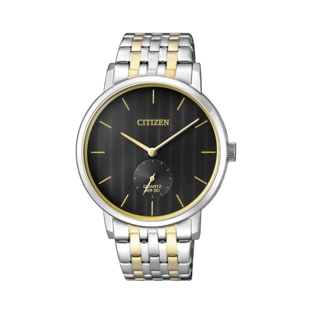 Crafted from rugged stainless steel with gold plating, obsidian black dial with gold highlights, and distinguished gold and silver toned band, this watch was designed for stylish durability. Built to last and possessing a 3-year warranty plus WR50, it is suitable for everyday wear, and with its refined looks can be styled up or down for any occasion. Precise to within 20 seconds over the course of a month, this is a timepiece you can depend on.