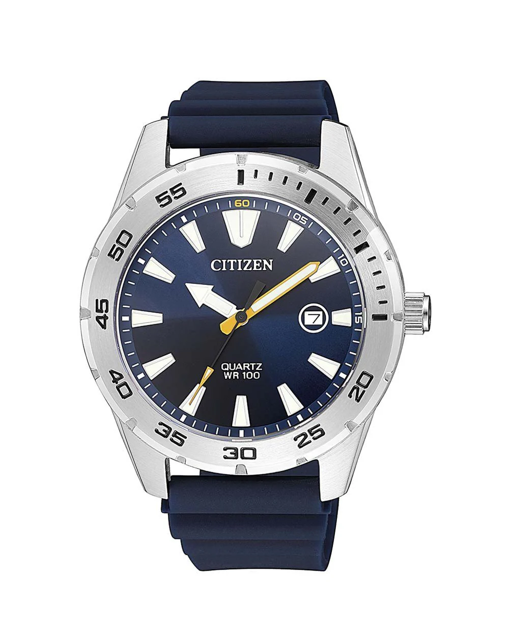 With a design reminiscent of the marine aesthetic of classic diving watches, this watch is outfitted with dependable precision features so you will always have time on your hands. Possessing reliable Quartz powered movement, it has an impressive 3 year battery life and is always accurate within 20 seconds each and every month. The captivating blue dial against a back drop of the brushed metal bezel and case is at once refined and sophisticated, and the supple polyurethane strap keeps things light and comfortable.