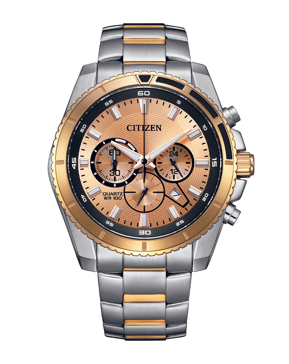 Refined and robust, the Citizen Quartz Sports Chronograph AN8204-59X is a standout among men’s watches, offering a seamless fusion of precision and aesthetics. Featuring a two-toned stainless steel band and a rich brown dial, this 43mm timepiece is built for the modern man who values both function and form. Designed with a 1/1 second chronograph and 60-minute timer, it also includes 12/24 hour time, a date display, and water resistance up to 100 meters—ideal for everyday versatility and active lifestyles. Protected by durable mineral crystal glass and powered by reliable quartz movement, this men’s chronograph epitomizes premium craftsmanship in sports watch design. Complete with an official Citizen box, it makes an exceptional gift or personal investment in lasting style.