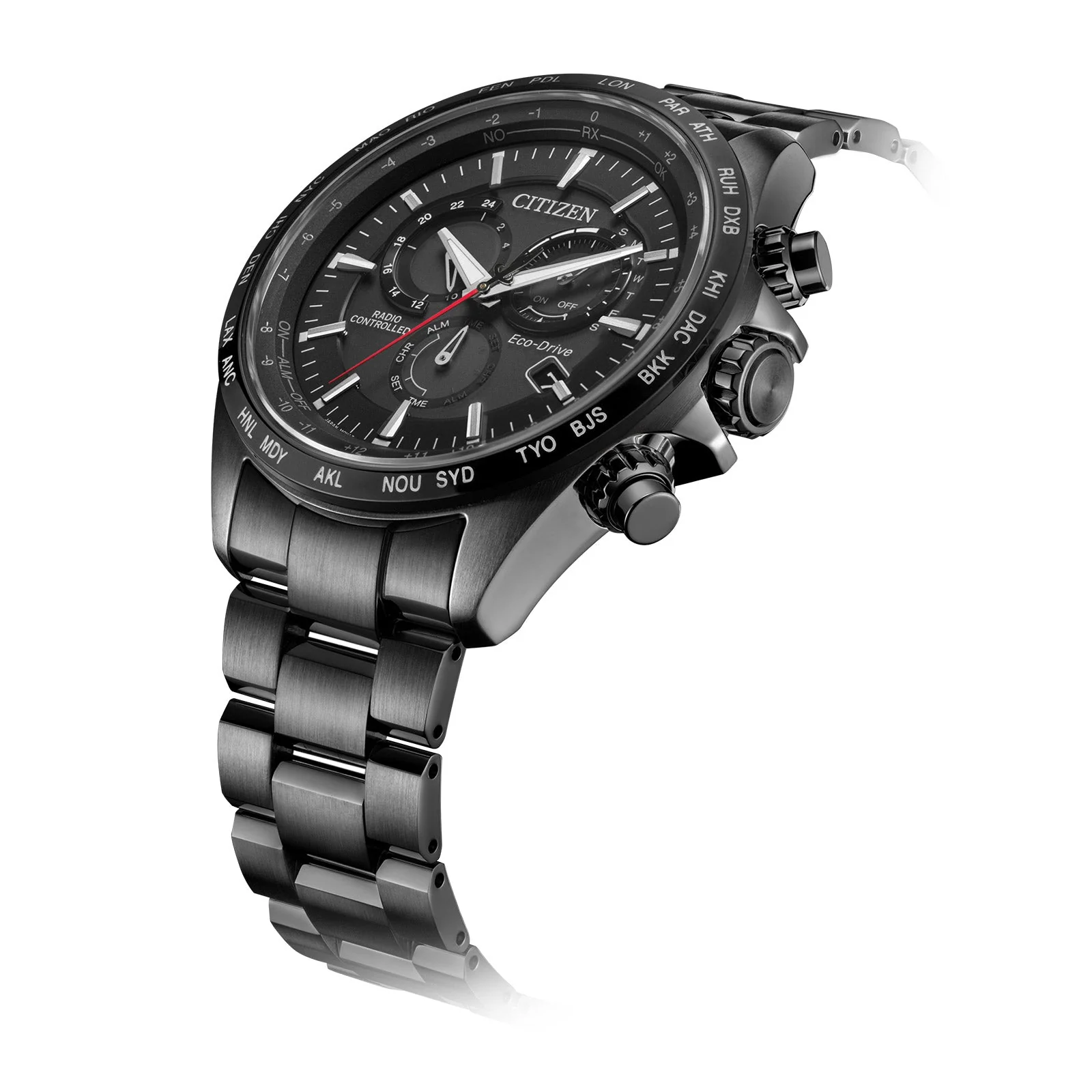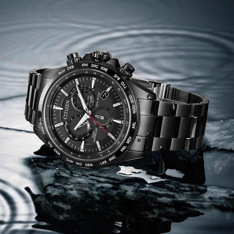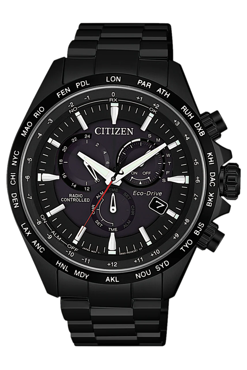 Blacked out Citizen watch with Global Radio Signal Reception. Get precise time adjustments anywhere on the planet. This model comes with Sapphire Crystal and a Water Rating of 100m. Other Features include Eco-Drive (recharged by any light source, no need for regular battery replacement), Insufficient Charge Warning Function, Overcharge Prevention Function, Power Reserve Indicator, Power Saving Function, Perpetual Calendar Chronograph.