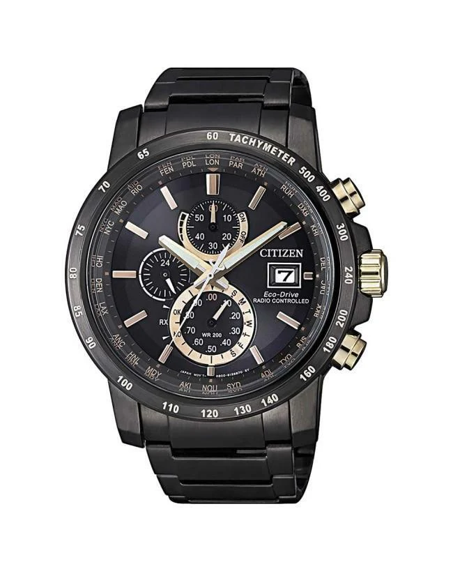 Exceptional in design. This perpetual calendar is radio-controlled in 26 cities, boasts a 1/20-second chrono that measures up to 60 minutes, and power reserve. Shown in stainless steel with black ion plating. Featuring Eco-Drive technology – powered by light, any light so it never needs a battery. With a Non-Reflective Sapphire Glass, and water Resistant up to 200 metres, this timepiece is finished with subtle gold tone accents for an eye-catching accessory that will turn heads wherever it goes.
