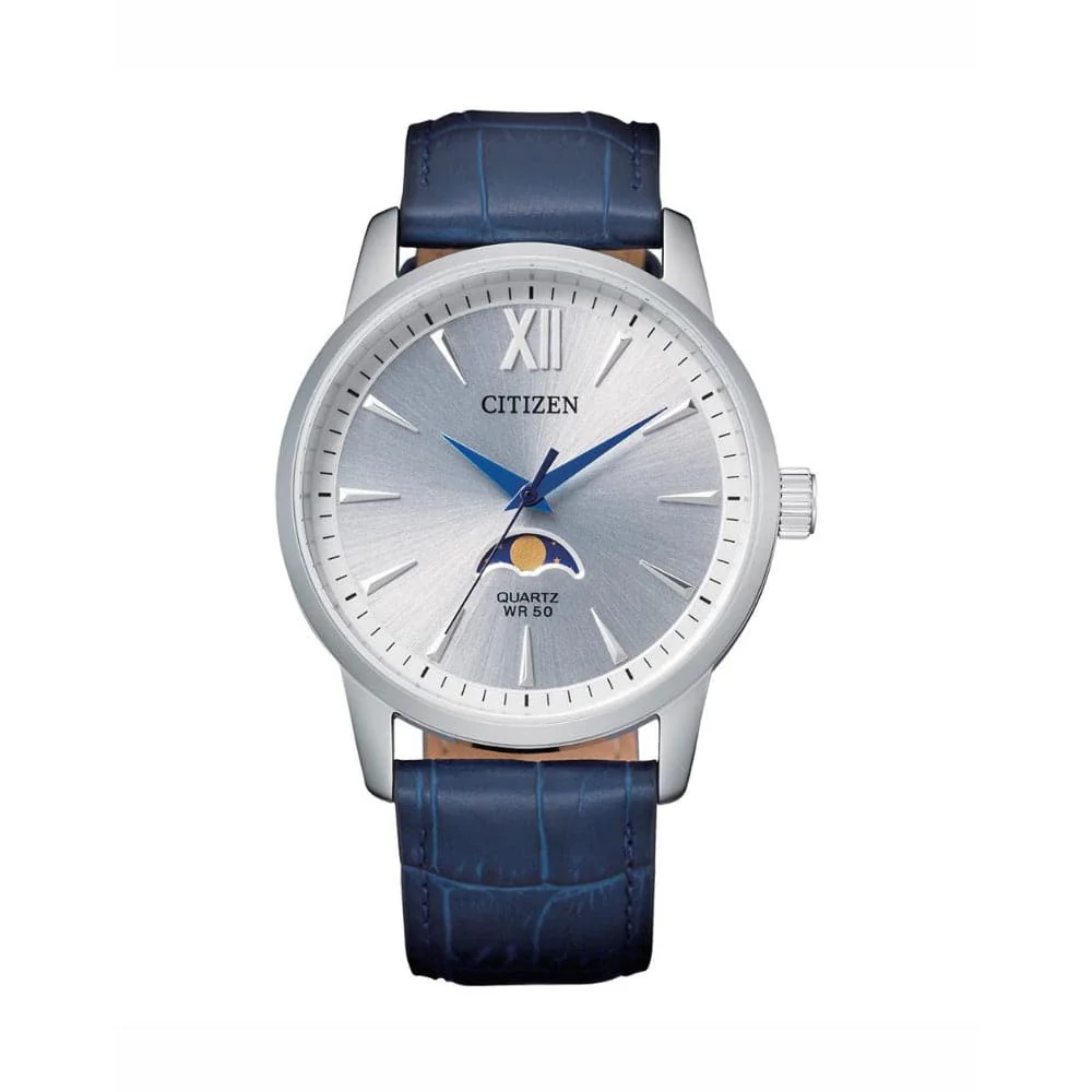 Stylishly masculine, this Quartz Moon Phase creates a dashing and suave impression. A combination of good looks, sturdiness and capability. It is perfect for wear in the office or having evening drinks with friends. Featuring a meticulous silver tone dial and cobalt blue leather strap. This stainless steel case and Moon Phase design is a timepiece for all occasions.