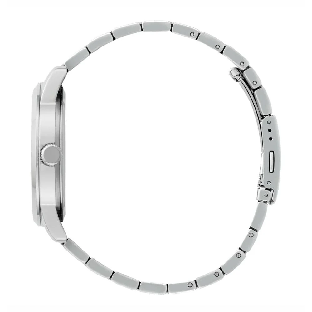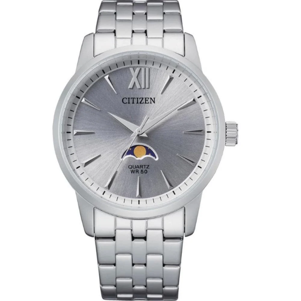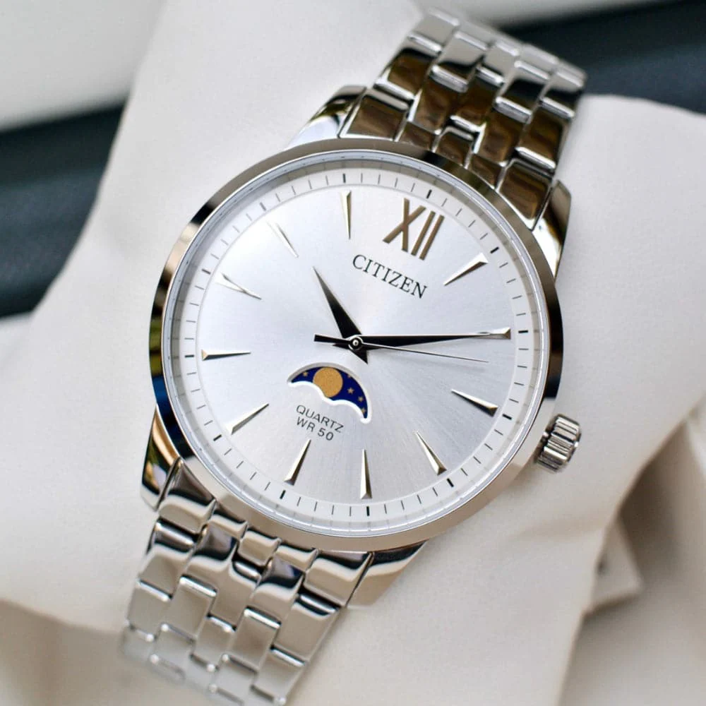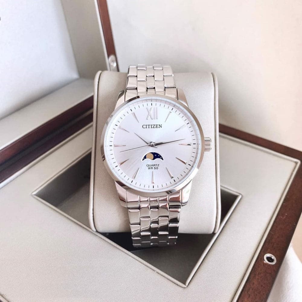 Stylishly masculine, this Quartz Moon Phase creates a dashing and suave impression. A combination of good looks, sturdiness and capability. It is perfect for wear in the office or having evening drinks with friends. Featuring a meticulous silver tone dial and Moon Phase design. It is a timepiece for all occasions.