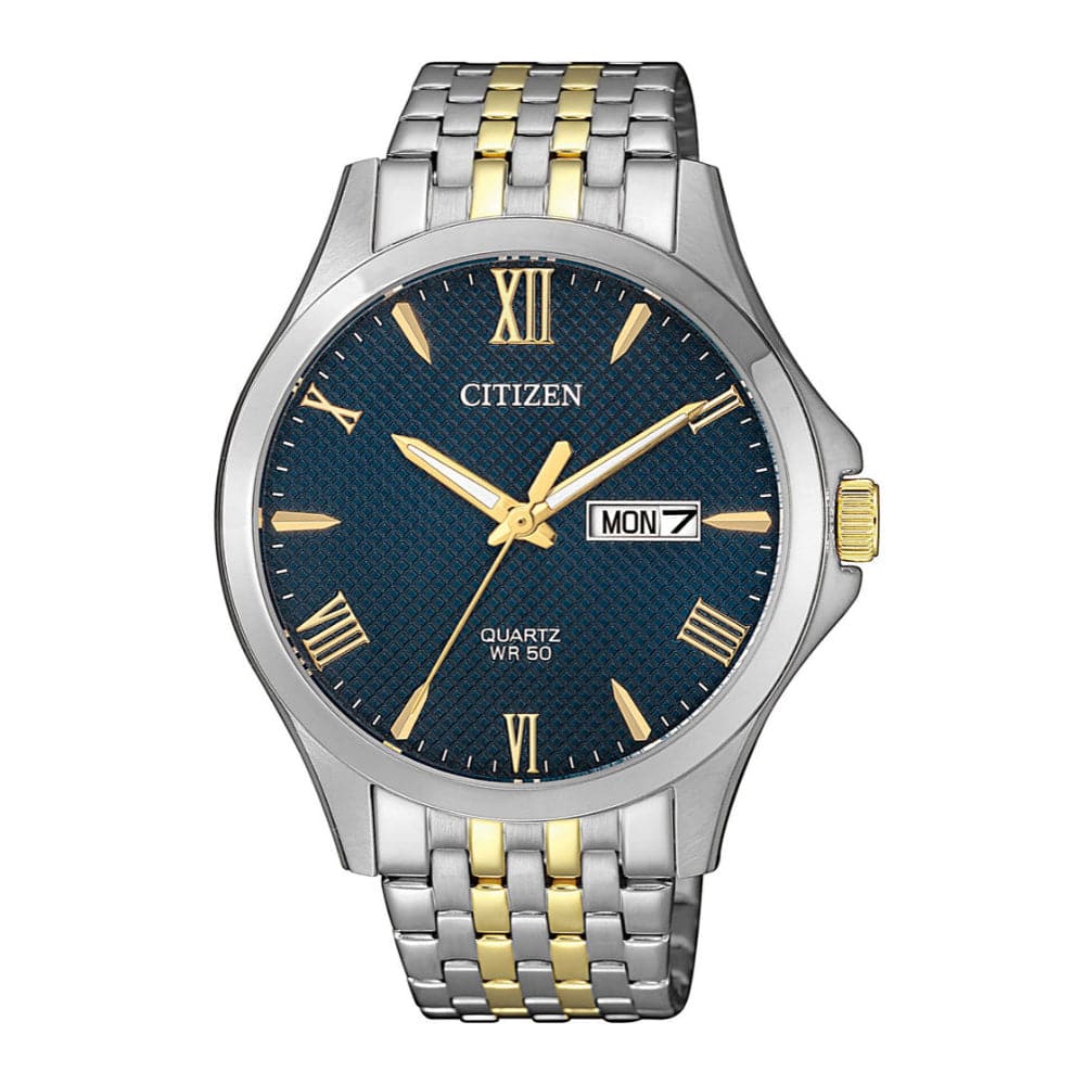 A classic comeback of the original wristwatch aesthetics that never fade off, the watch boosts a luxury patterned blue dial with roman numerals and indexes alternating hour markers and large Day and Date display completing the classic feel. The watch is fitted with a soft multilink two-tone stainless-steel bracelet which rests gracefully on the wearer’s wrist. Citizen Quartz watches are powered by high precision Quartz movement, which is Made in Japan, they are extremely reliable and have very low Maintenance to give you accurate timekeeping effortlessly.