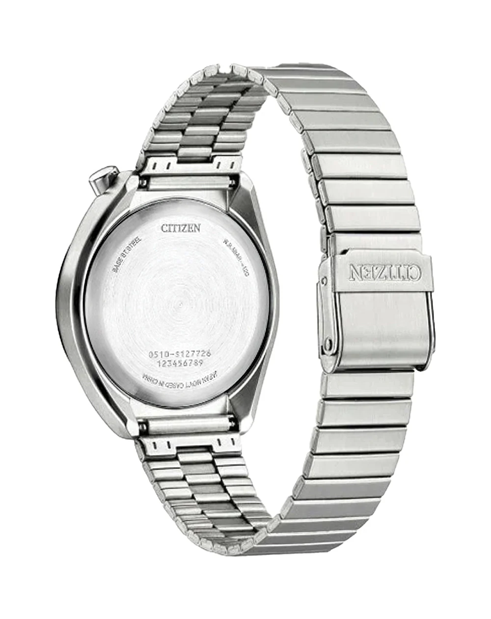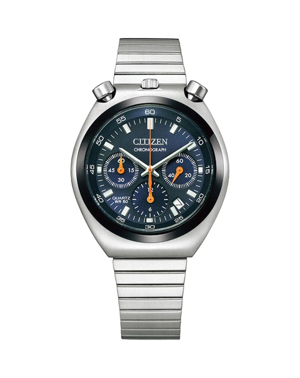This Citizen Bullhead men’s watch from our Dress Collection features a textured deep black/white dial, prominent stainless-steel case and bracelet. It presents a co-ordinated but bold look. The dial displays the date and 12/24 time, while chronograph, supported by advanced quartz precision timekeeping, can measure up to 60 minutes in one second increments.