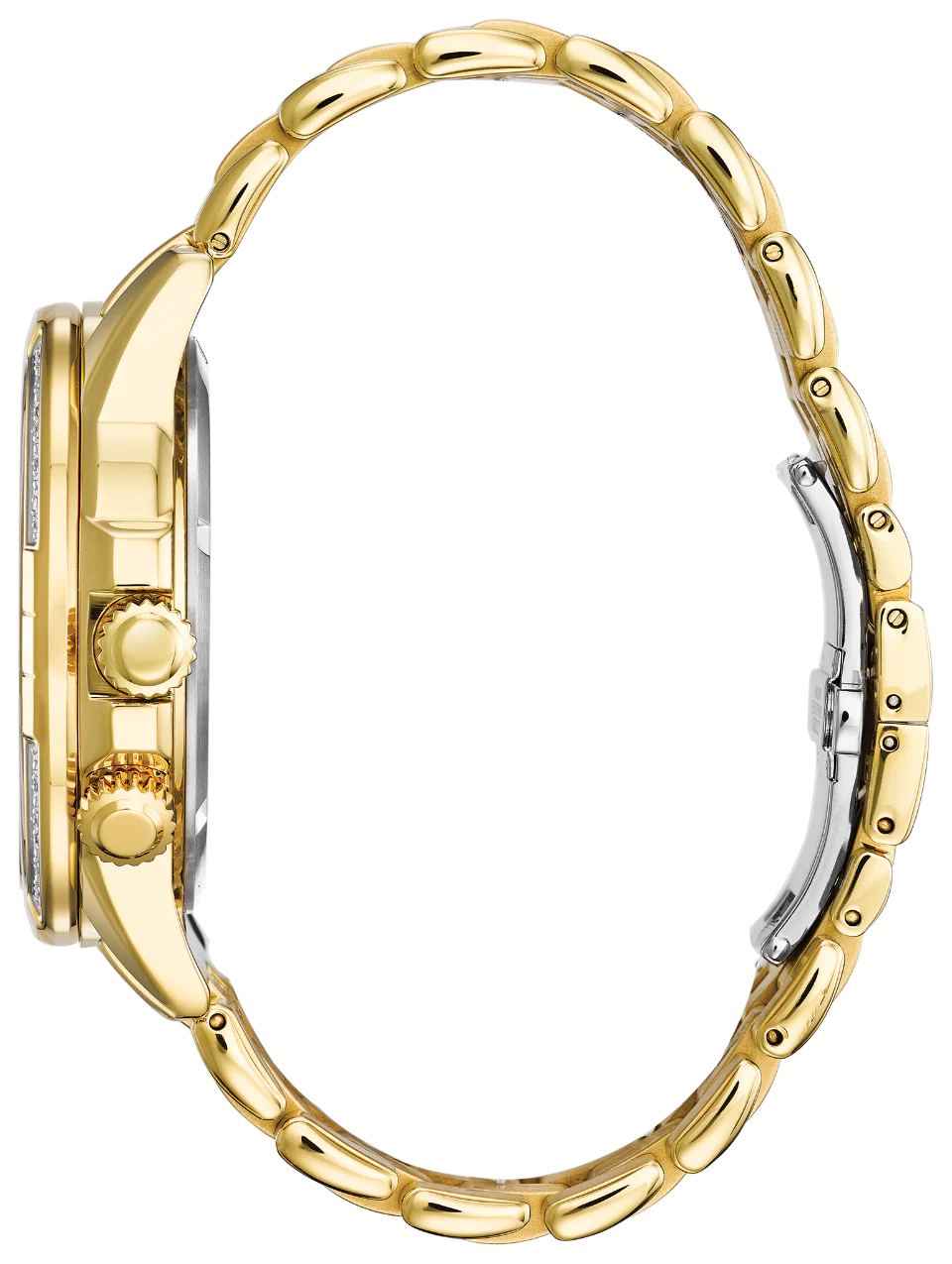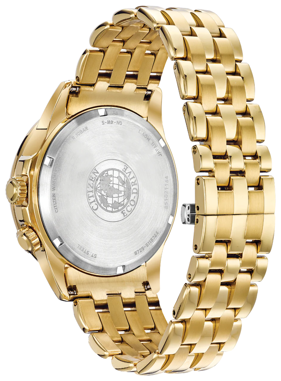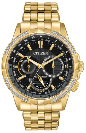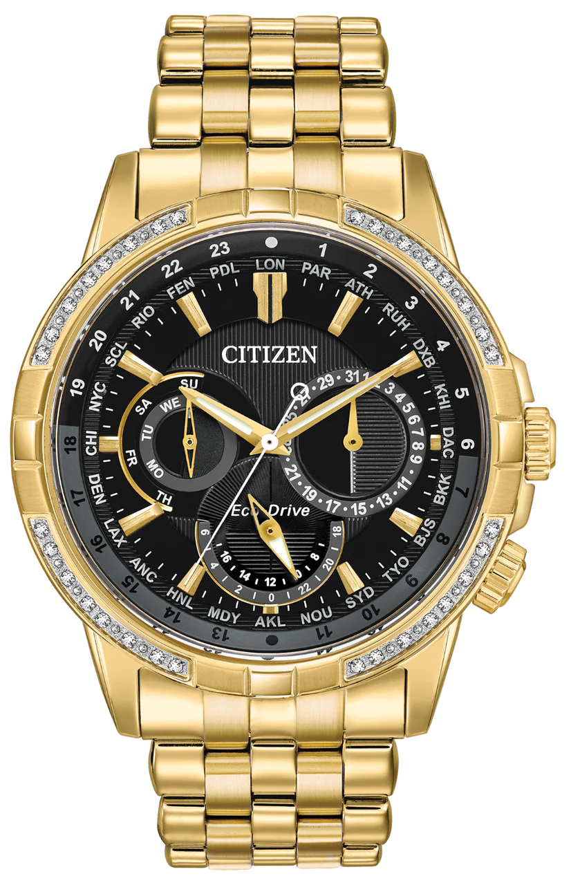 Eye-catching in terms of both refinement and functionality, this watch possesses a stunning fusion of matte and polished gold set against a bold ebony face surrounded by 32 diamonds intricately set into the bezel. Designed for world time presentation with comprehensive international face markings, it also provides day/date display, 12 and 24 hour time and convenient low charge indicator. Delivering confidence by way of WR100/10bar and precision to within 15 seconds over the course of an entire month, it is also powered by Eco-Drive technology, harnessing light energy with 6 months power in reserve so that it never requires batteries.