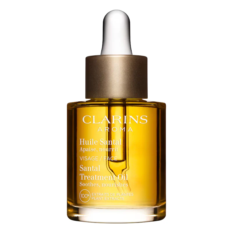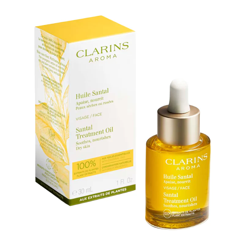 Embrace the comforting touch of Clarins Aroma Santal Treatment Oil for skin that’s as radiant as you are.