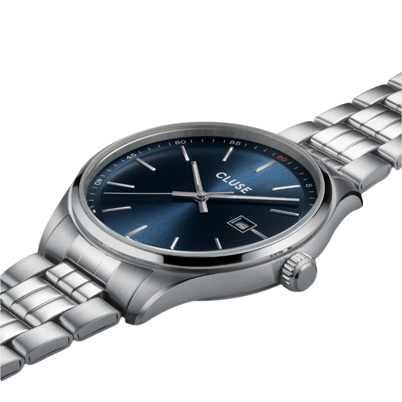 Refined and contemporary, the CLUSE Antheor men’s watch blends durable construction with elevated design. Featuring a 41mm brushed and polished stainless steel case and a striking blue sunray dial, this timepiece captures attention with effortless style. Its 20mm silver stainless steel strap integrates seamlessly for a cohesive, modern aesthetic that suits both casual and formal settings.