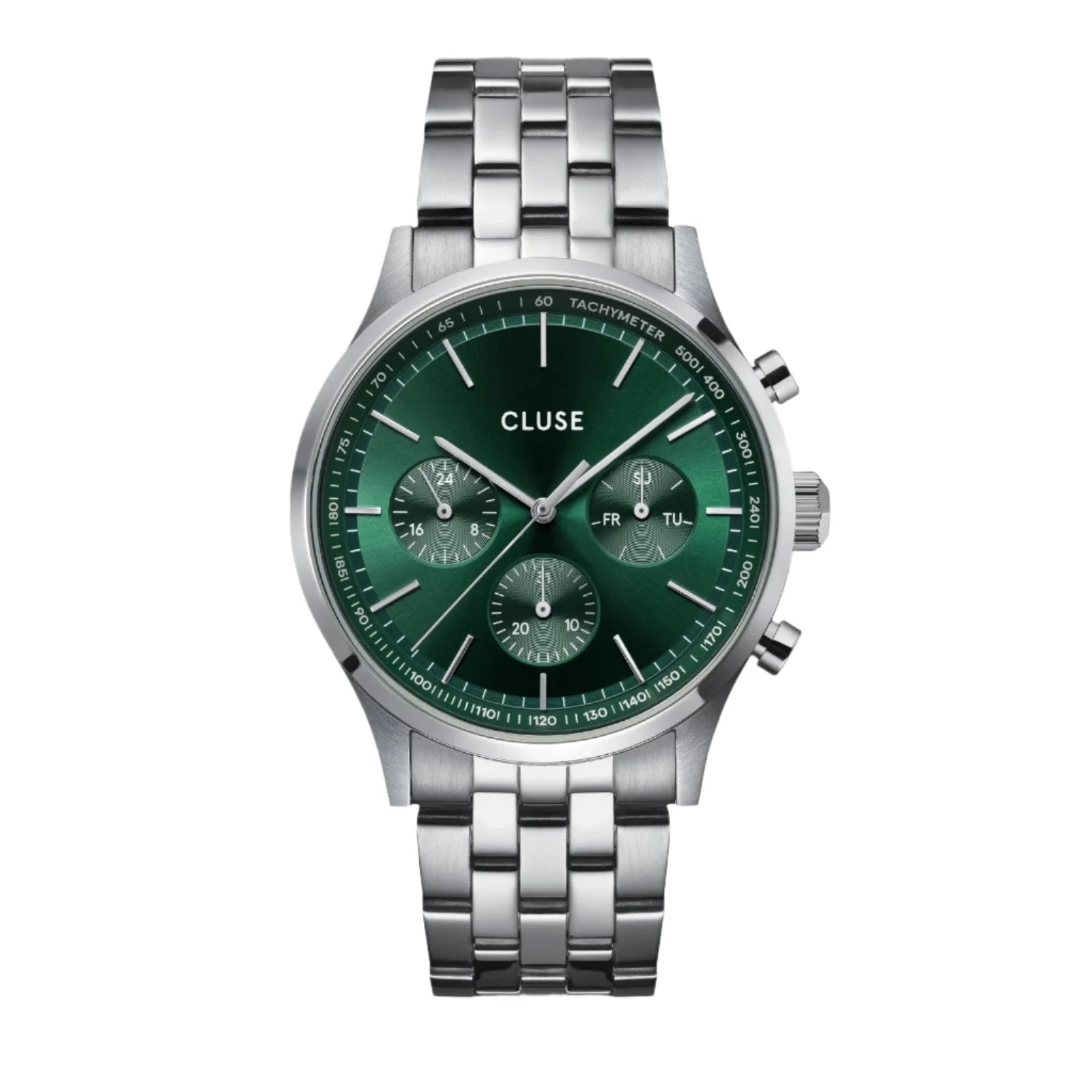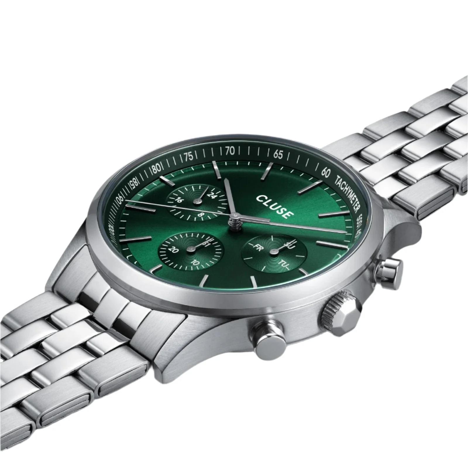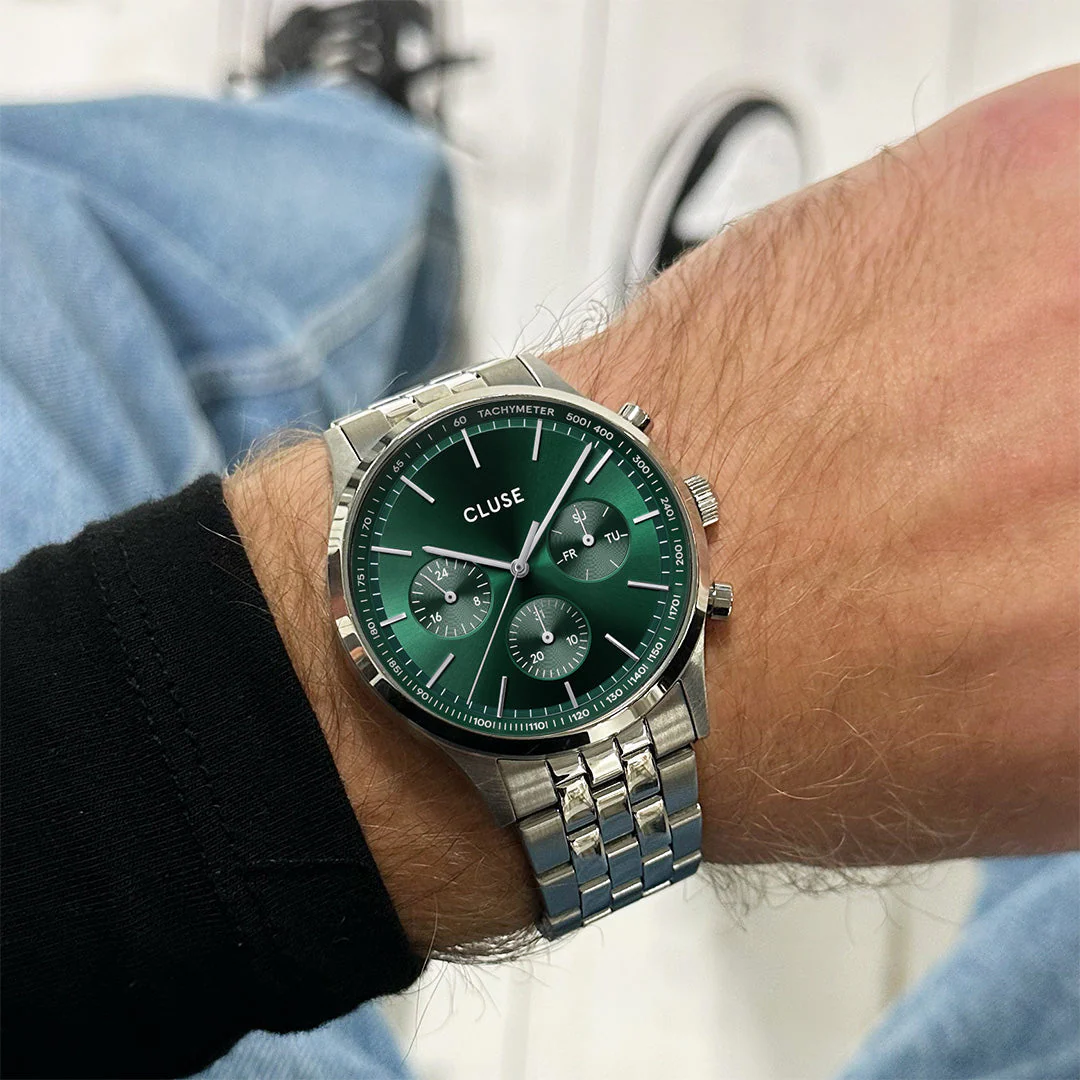 Refined yet confidently modern, the CLUSE Antheor Multifunction men’s watch brings together sleek design and functional elegance. Crafted with a 41mm brushed and polished stainless steel case and linked to a 22mm silver stainless steel strap, it offers a structured, contemporary silhouette. The green sunray dial stands out with subtle depth, accented by three multifunction sub-dials for day, date, and 24-hour timekeeping. Protected by mineral crystal glass and powered by precise quartz movement, this timepiece ensures durability and accuracy. With 50 meters water resistance and a polished finish, it fits seamlessly into the watches category as a statement of both performance and style. Ideal for everyday wear or sophisticated looks, it’s a versatile essential in any men’s watch collection.