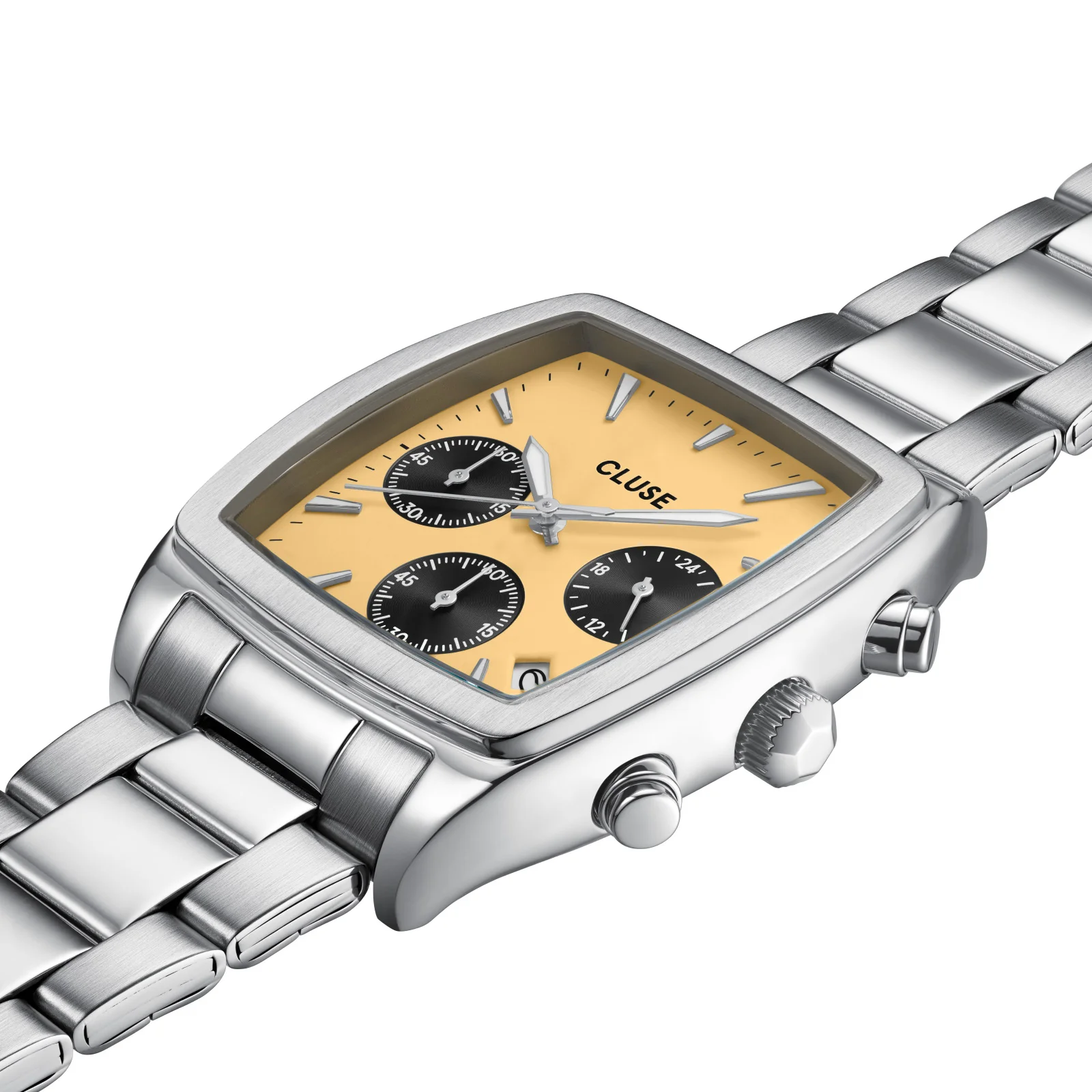The Quartaut Chrono watch for men boasts a distinctive blend of strength and luxury. Featuring a streamlined silver coloured tonneau case, stainless steel 3-link strap and yellow dial with 3 grey subdials. Scuplted to perfection, offering both comfort and style.