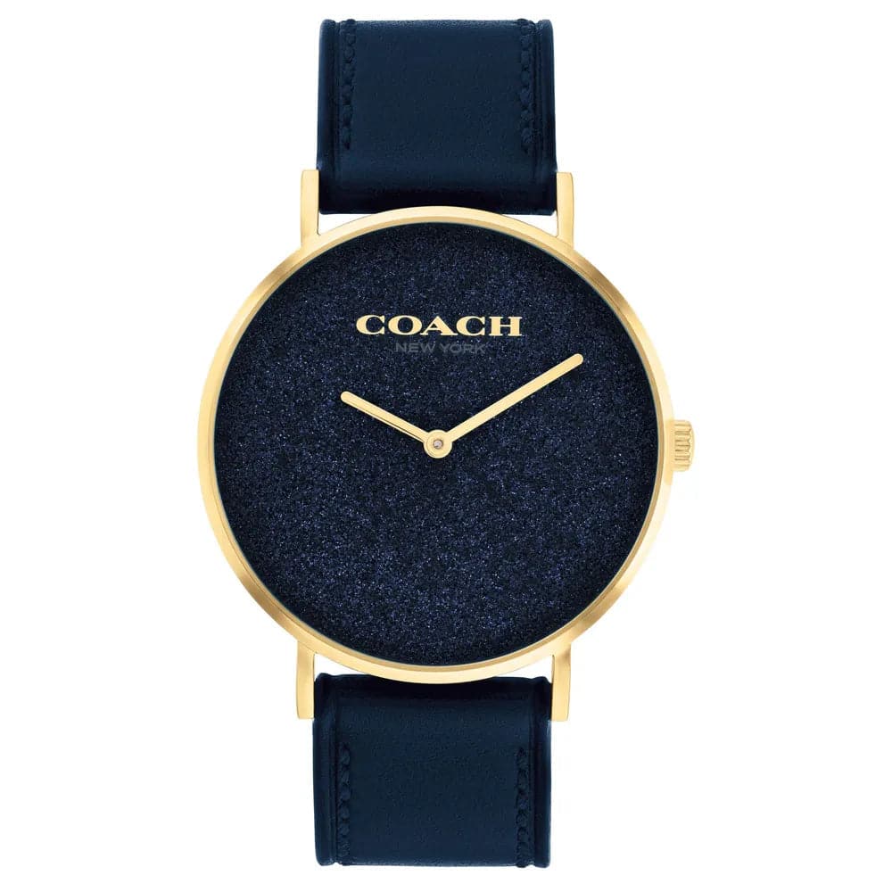 Named for a quiet street in New York City’s West Village, the Perry is a traditional round watch perfect for every day. Finished with a navy leather strap, the gold tone design dazzles with a shimmery glitter dial.