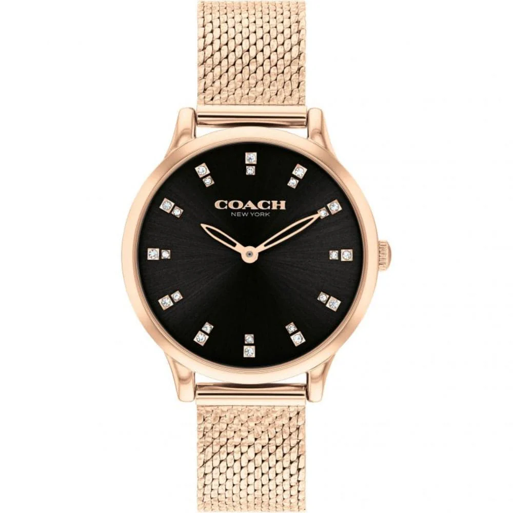 Named for the vibrant art-filled neighborhood on the West Side of Manhattan, the Chelsea is an elevated choice for day or night. The 32mm case with sleek rose gold tone bracelet design shimmers with stacked crystal markers on the black dial.