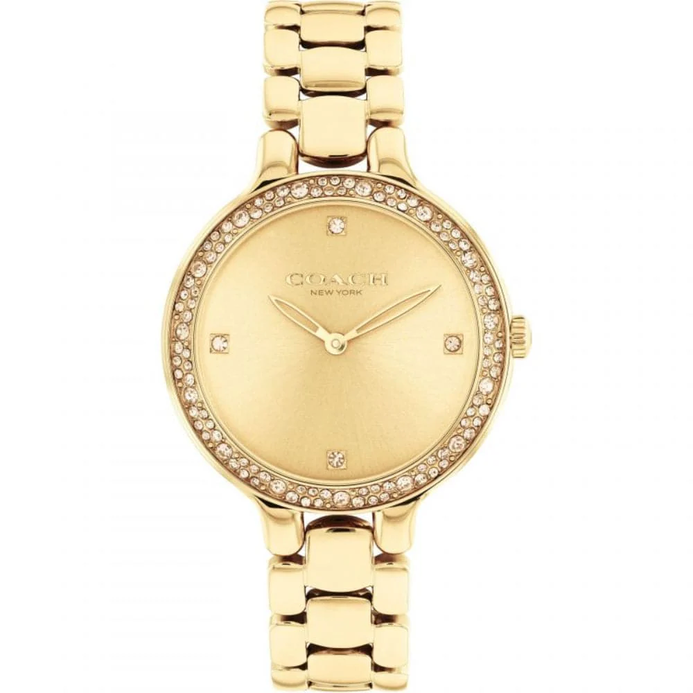 Ladies Coach watch from the Chelsea family. Featuring a 32mm round gold IP case, gold sunray dial and crystal set bezel. Finished on a 3 link carnation gold IP bracelet. Water resistant to 3ATM.