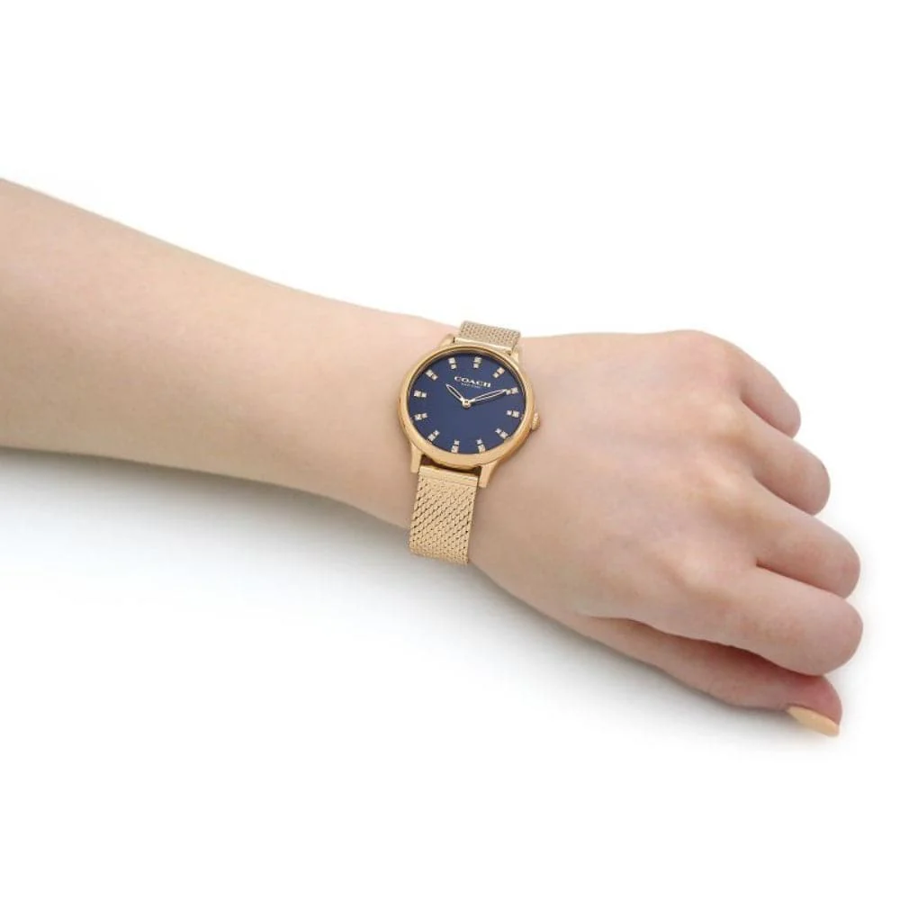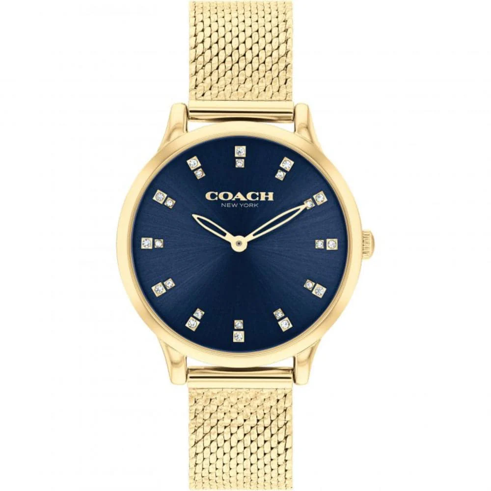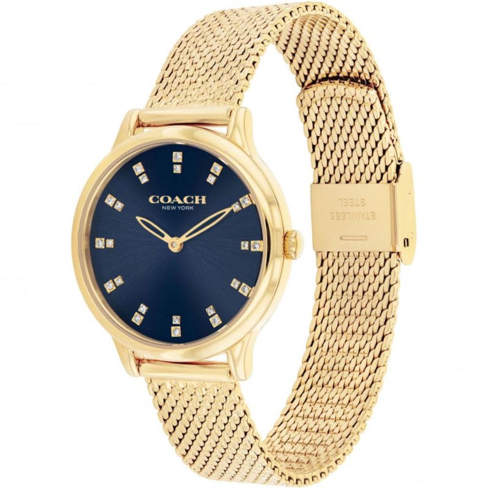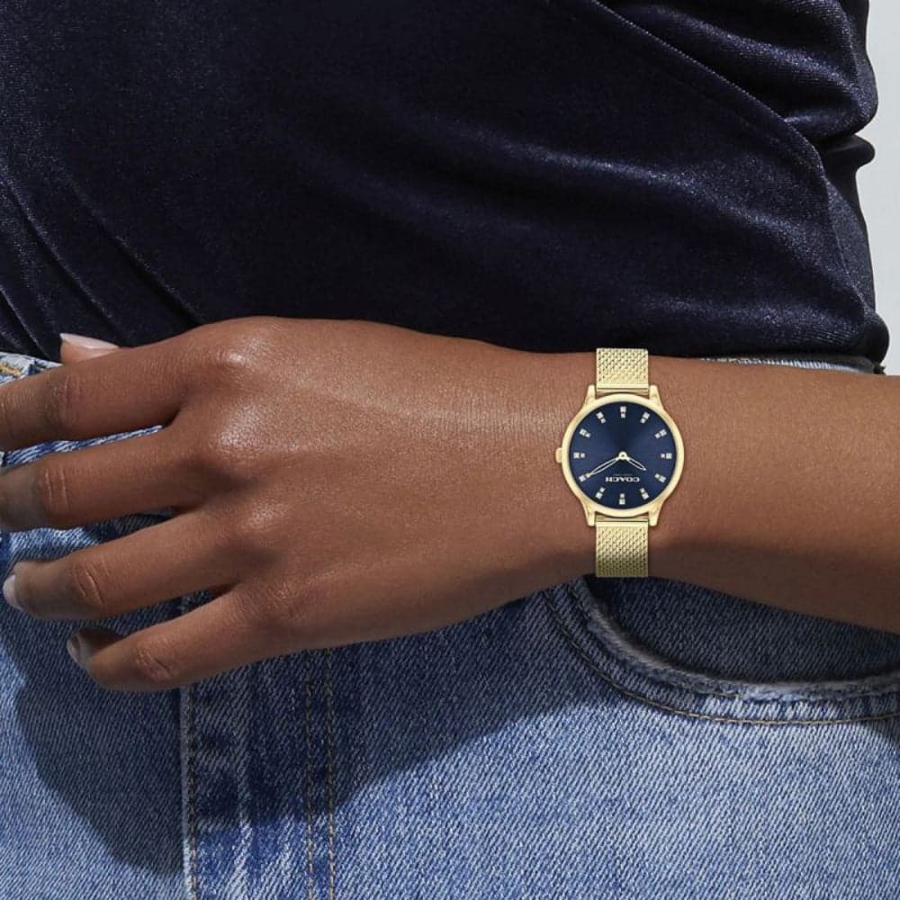 Named for the vibrant art-filled neighborhood on the West Side of Manhattan, the Chelsea is an elevated choice for day or night. The 32mm case with sleek yellow gold tone bracelet design shimmers with stacked crystal markers on the blue dial.