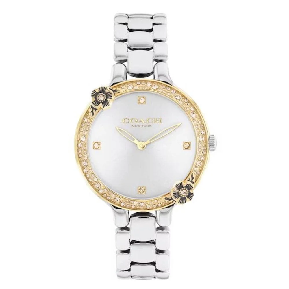 Named for the vibrant art-filled neighborhood on the West Side of Manhattan, the Chelsea timepiece from COACH is an elevated choice for day or night. Crafted in two-tone stainless steel, the 32mm case shimmers with crystals on the gold-tone markers and bezel, which features Coach prairie-inspired Tea Roses. Additional features include a silver-tone dial, mineral crystal and quartz movement. The stainless steel bracelet secures with a deployment closure. Water-resistant to 99 feet, this watch has a mercury-free battery.