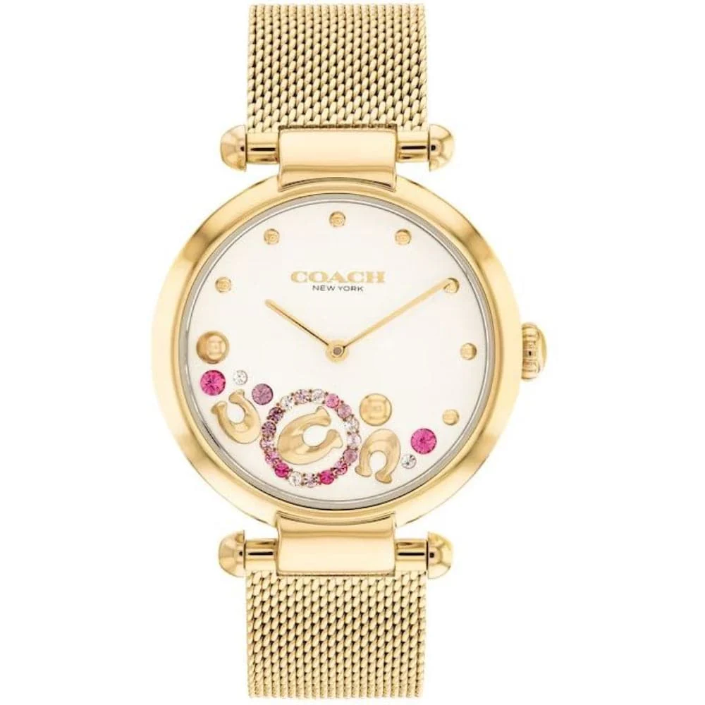 Enjoy playful details in a sophisticated style with this ladies’ Coach Cary gold-toned ion-plated watch, showcasing a sweet “C” motif with pink crystals.