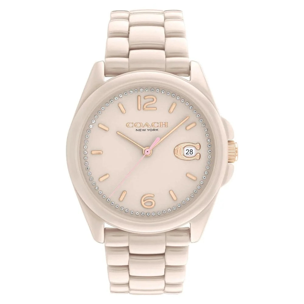 This Coach Greyson beige ceramic women’s watch features a quartz movement and boasts a case diameter of 36 mm, case thickness of 9.95 mm, and bandwidth of 19 mm. Its case and strap are made from durable ceramic, the mineral crystal provides durability, and the dial offers a sophisticated look. The watch has a water resistance of up to 3 ATM and includes a secure push-button deployment clasp.