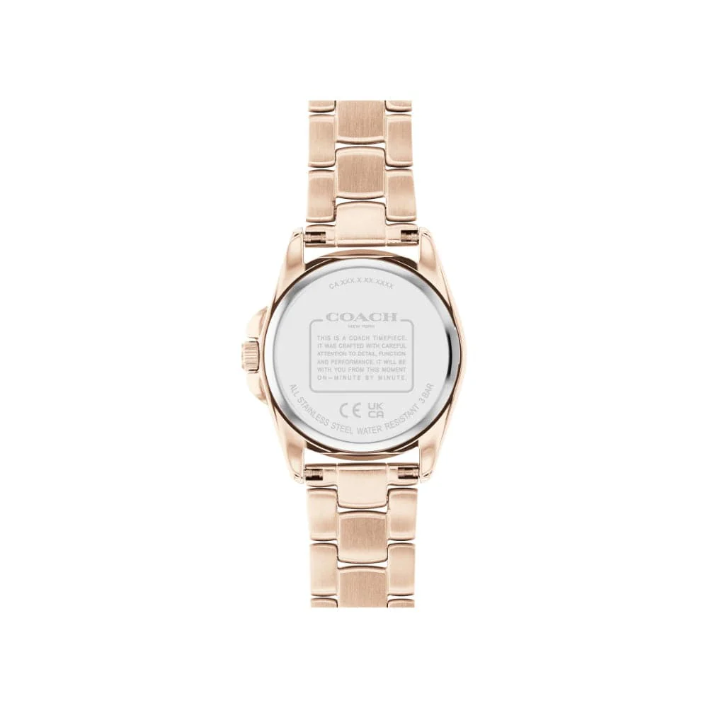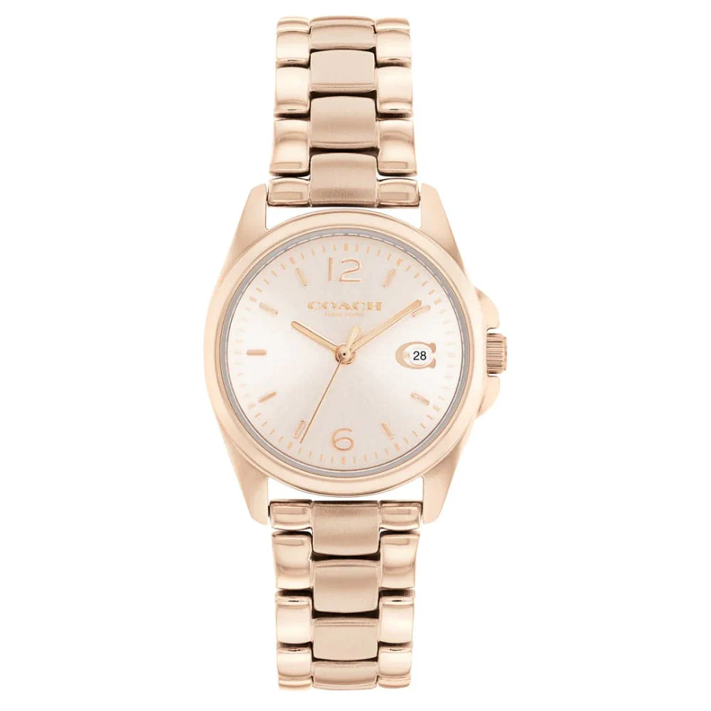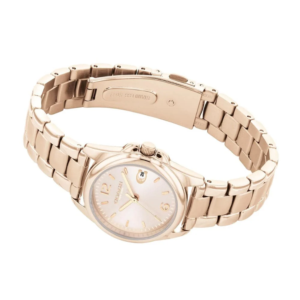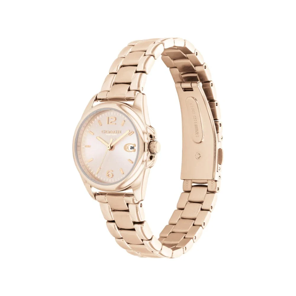 The epitome of refined sophistication, Greyson is a polished, go-everywhere timepiece. Featuring a mix of numerical and stick markers, this carnation gold-tone bracelet design is finished with a Coach Signature date window and marker at 3 o’clock.