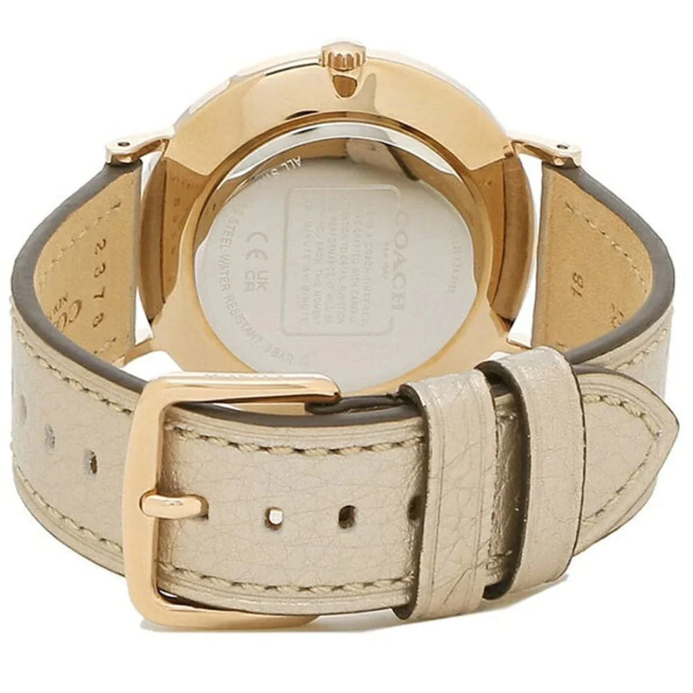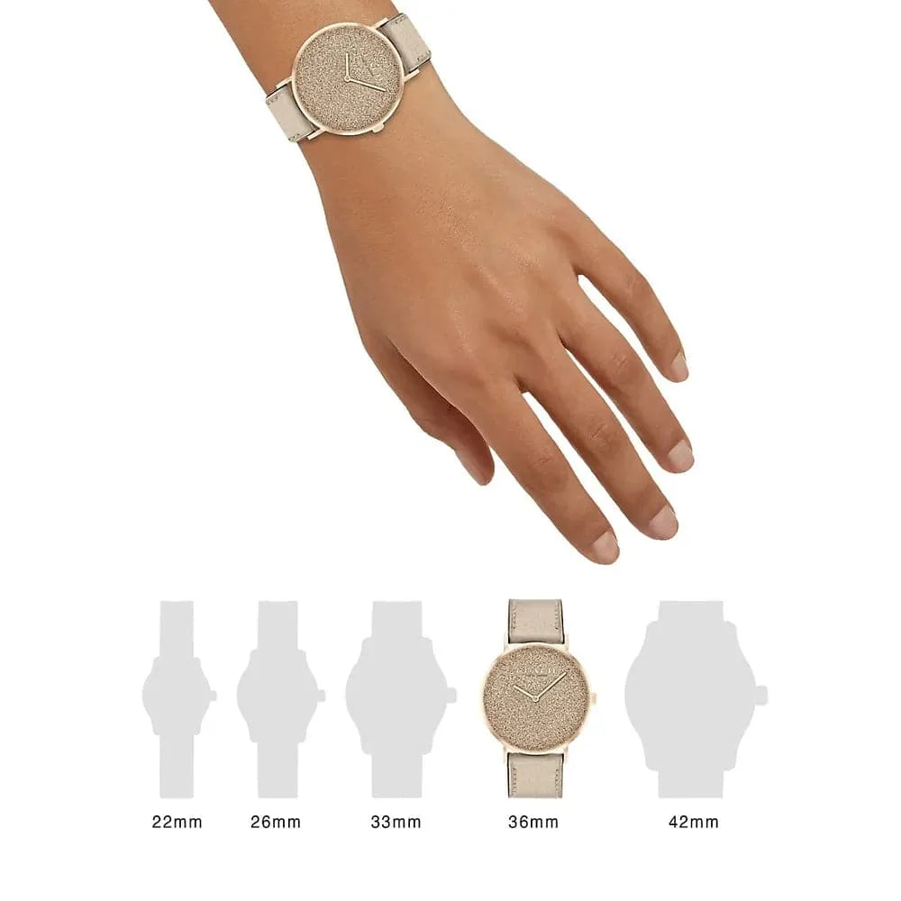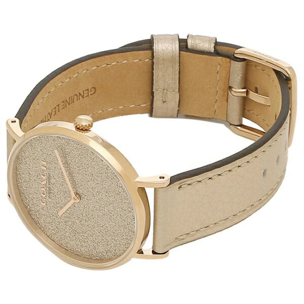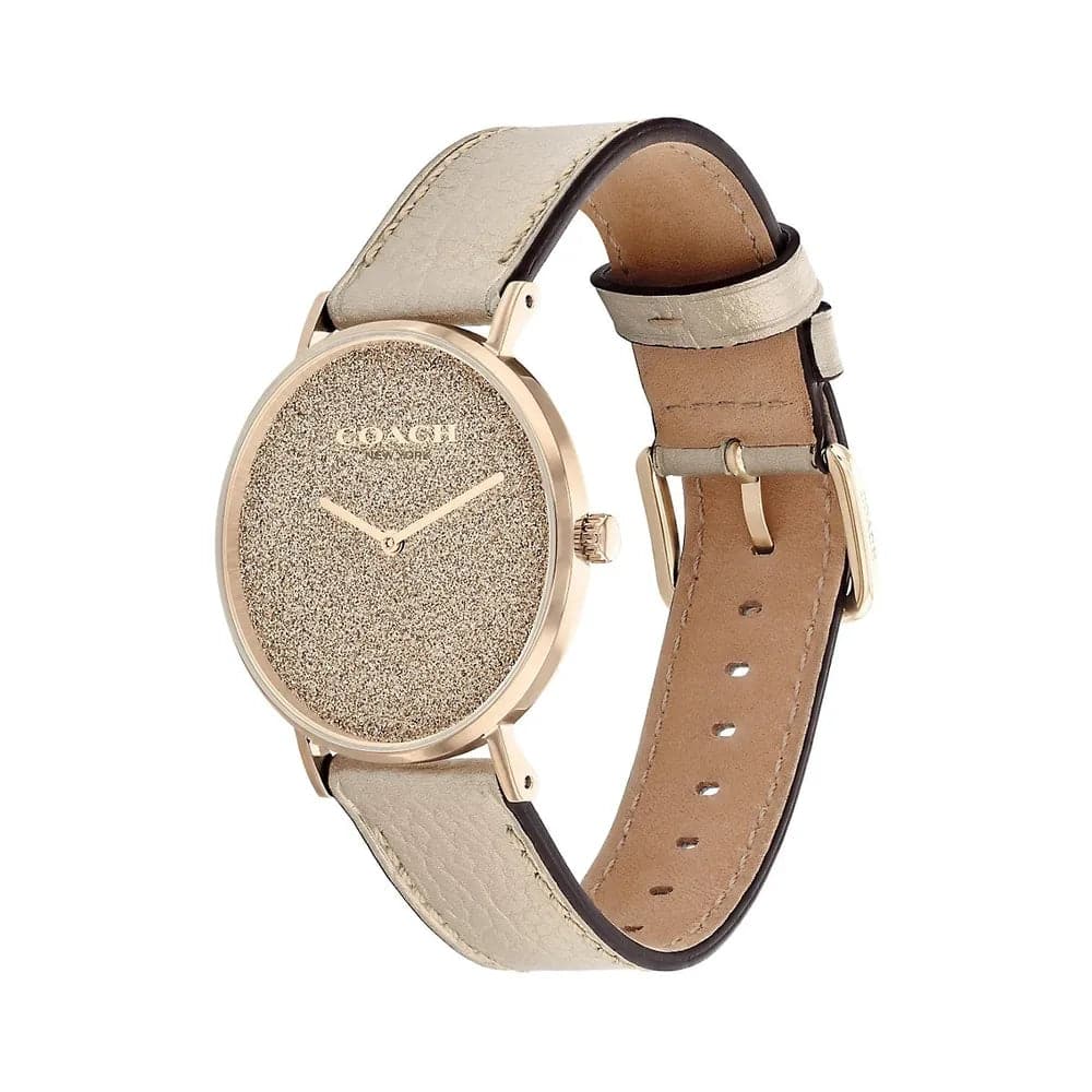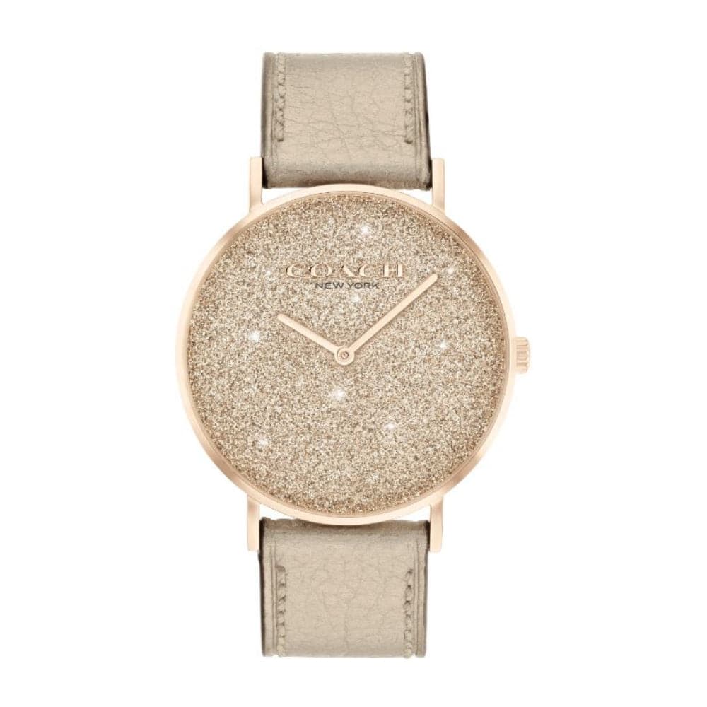 Named for a quiet street in New York City’s West Village, the Perry from COACH is a traditional round watch perfect for every day. Finished with a metallic gold leather strap, the carnation gold-tone design dazzles with a shimmery glitter dial.