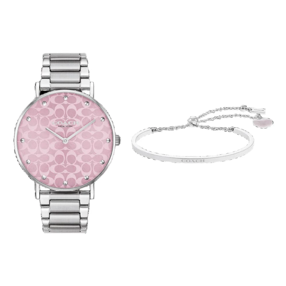From COACH, this lovely watch and bracelet set would make a fantastic gift for a cherished lady in your life or a delightful treat for yourself. Featuring a 36mm stainless steel case and matching link bracelet, this remarkable timepiece is as resilient as it is beautiful, with water-resistance up to 3 bar. It is powered by 3-hand quartz movement, and, sealed by mineral crystal, the pink dial is patterned with the COACH symbol and exhibits round, raised silver-tone indices. The matching bolo bracelet features a heart charm at the end of the links.