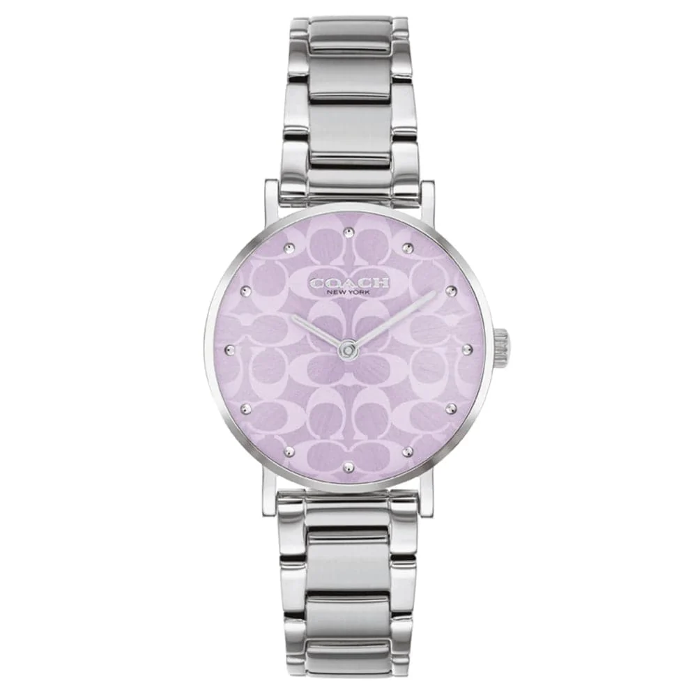 Named for a quiet street in New York City’s West Village, the Perry is a traditional round watch perfect for every day. This refined Gift Set includes the stainless steel bracelet timepiece featuring a lilac Coach Signature dial, and a slender bar slider adjustable bracelet detailed with a lilac enamel heart charm. Wear together or separately.