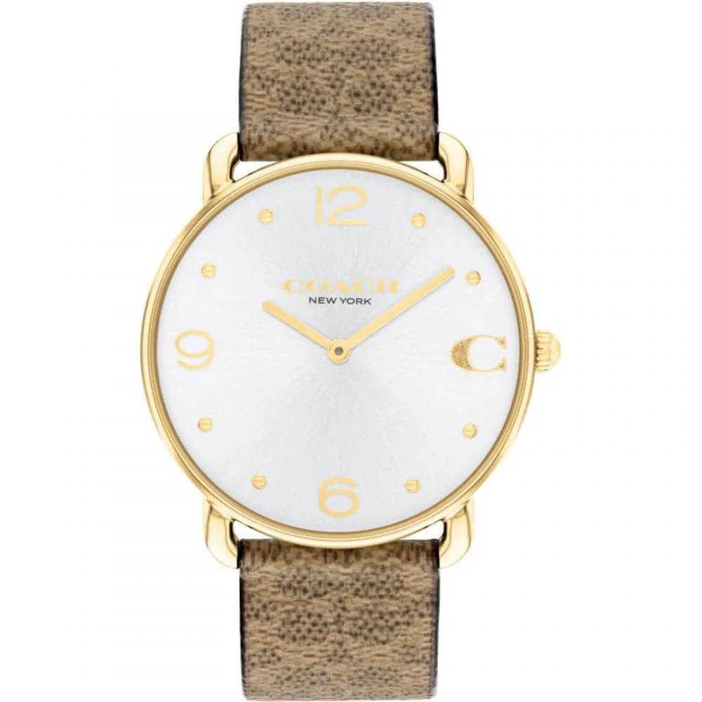With clean lines and a modern minimalist sensibility, the Elliot is a true design classic ready for workdays and weekends. Finished with a Coach Signature canvas strap, this gold tone round watch features a white sunray dial detailed with the Coach Signature marker at 3 o’clock.