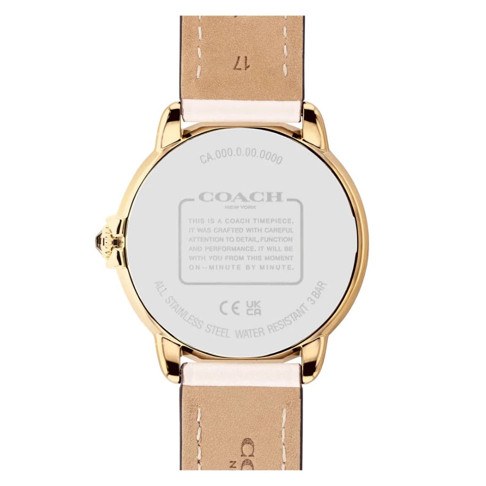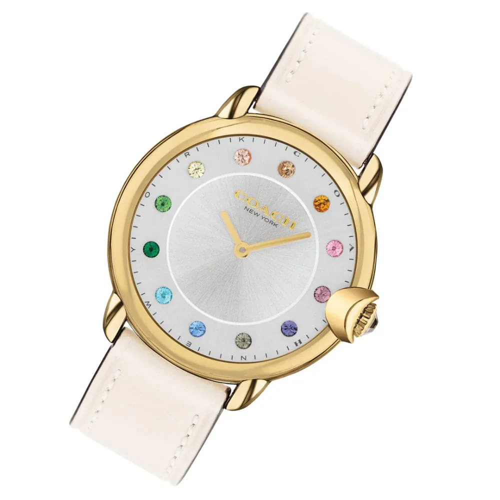 Refined and modern, the Arden watch is a minimalist, go-with-everything style. This 36mm gold-tone design features a silvery white dial detailed with sparkling rainbow crystal markers and is finished with a dimensional Coach Signature crown. The chalk leather strap secures with a buckle clasp. With a mineral crystal and quartz movement, this watch is water-resistant to 99 feet.