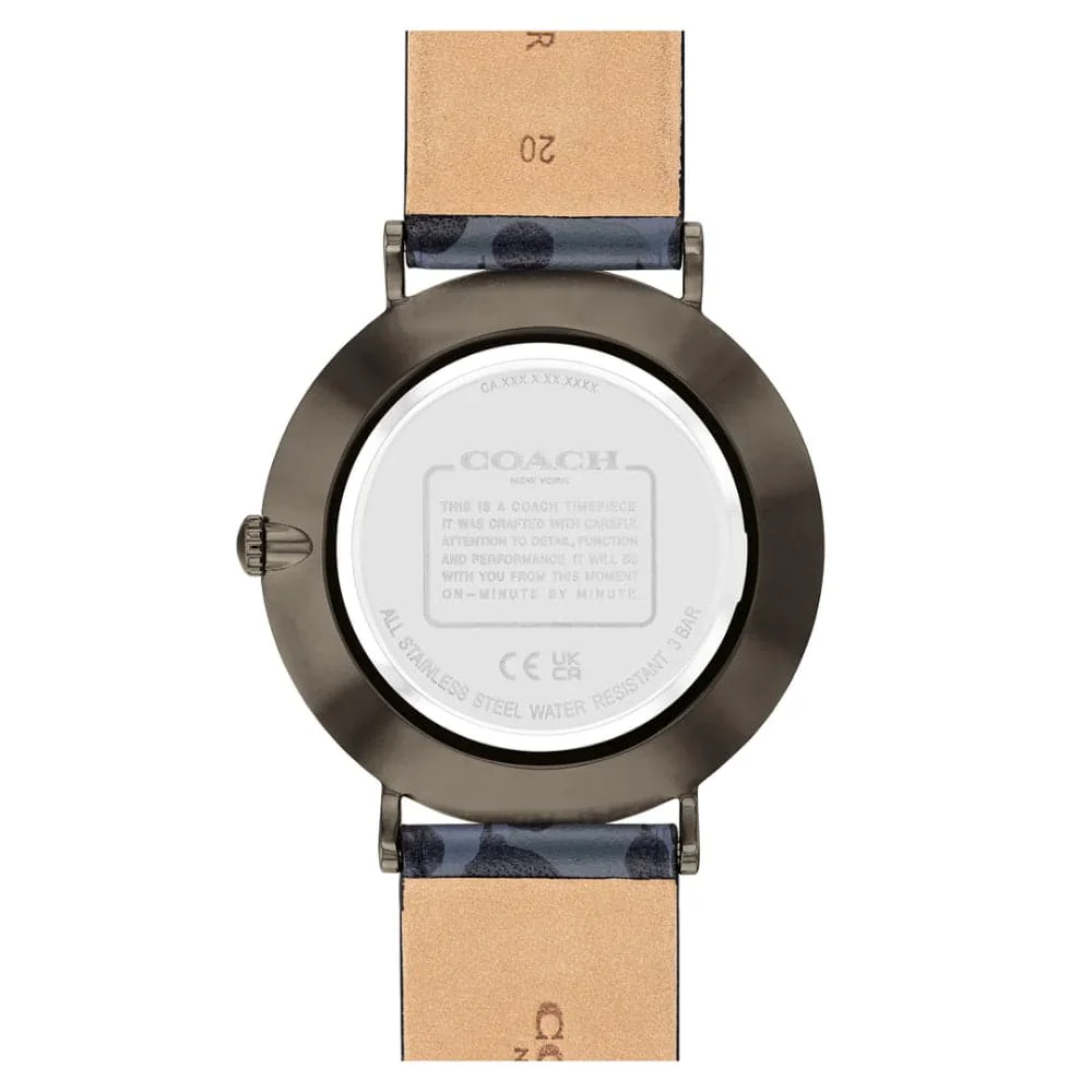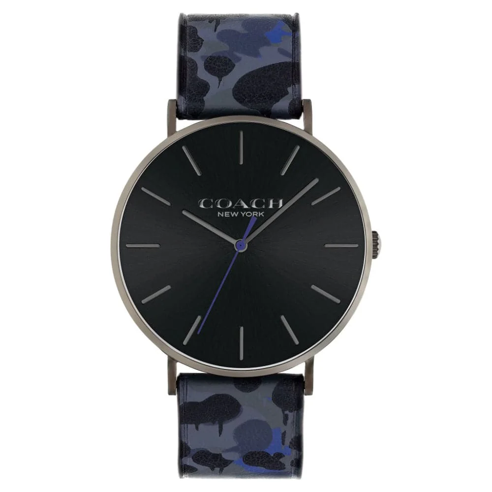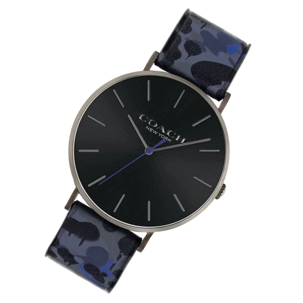 This quartz-powered wristwatch has a case diameter of 41 mm with a thickness of 7.85 mm and is constructed of Ionic Plated Grey 6 Steel. The dial is a striking black sunray display and the strap is made of blue calfskin. It comes with a tongue buckle clasp and is water-resistant up to 3 ATM.