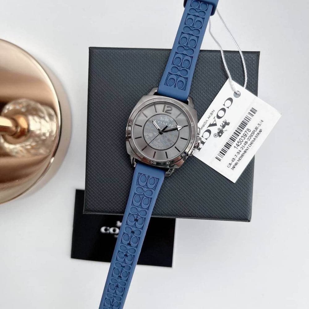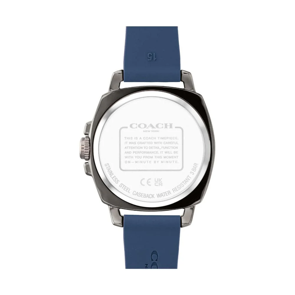 A textured rubber strap adds a sporty signature edge to a scaled-down version of the popular Coach Boyfriend style. Crafted by a master watchmaker, black-plated 34mm case, durable and water-resistant to a depth of 99 feet.