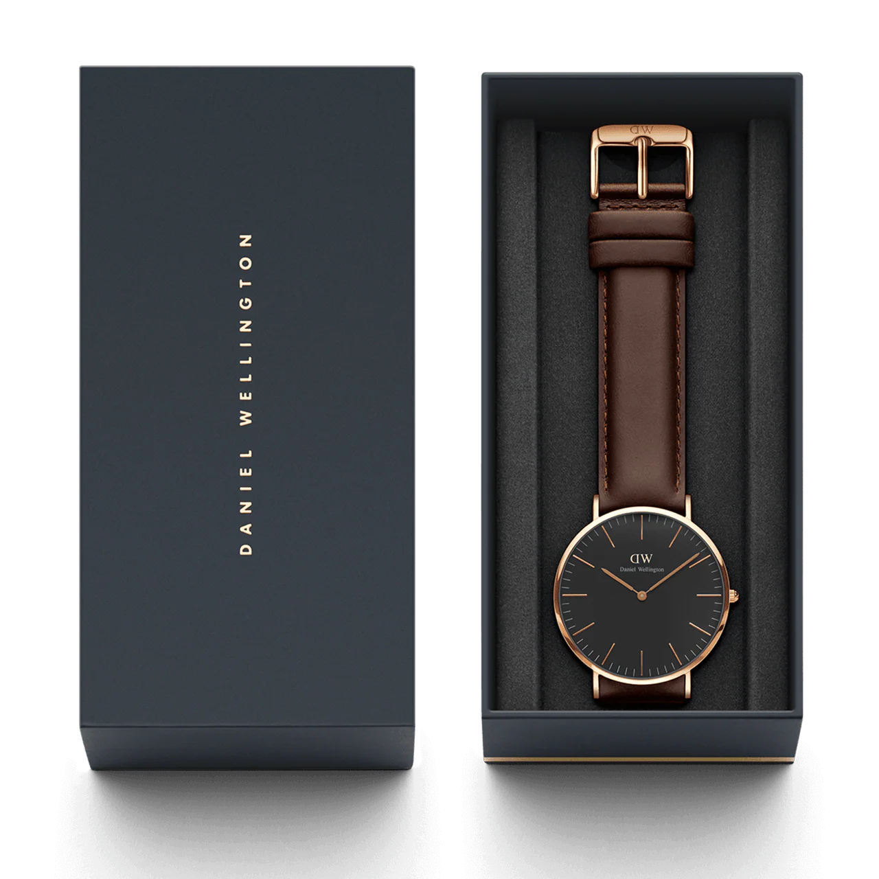 The Daniel Wellington Classic Bristol DW00100125 is a refined men’s watch that blends timeless design with modern sophistication. Featuring a sleek 40mm black dial housed in a double-plated rose gold-tone stainless steel case, this piece embodies minimalist elegance. The dark brown leather strap adds a touch of warmth and comfort, making it ideal for both formal attire and everyday wear. Crafted with Japanese Quartz Movement, this watch ensures precise timekeeping, while the mineral crystal glass provides excellent clarity and durability.