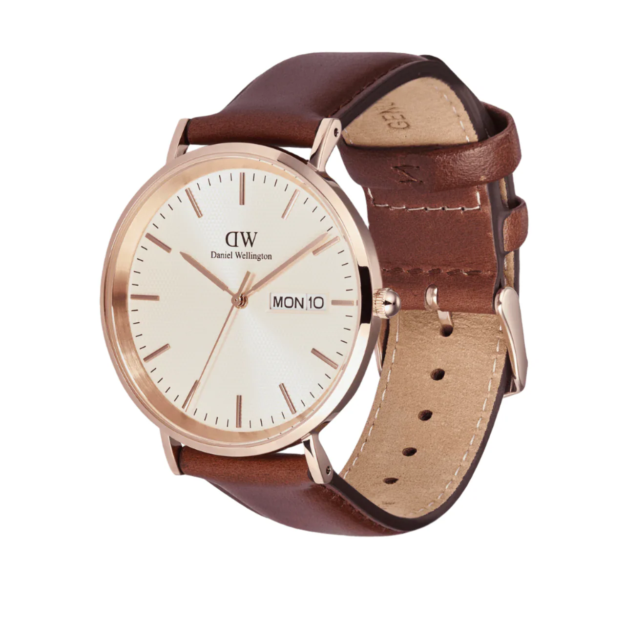 Refined and timeless, the Daniel Wellington Classic St Mawes Rose Gold Champagne Dial Watch DW00100829 captures the essence of minimalist elegance. Crafted from rose gold-plated stainless steel and paired with a rich brown leather strap, this men’s watch blends classic aesthetics with contemporary design. The champagne-colored dial features slender markers and a discreet date display, housed beneath durable mineral crystal for everyday resilience. With a 40mm case and slim 6mm profile, it offers a sleek silhouette perfect for both formal and casual ensembles. Driven by precise Japanese quartz movement and water resistant up to 3 ATM, it marries reliability with sophisticated style. Designed for versatility and enduring charm, this timepiece is a distinguished addition to any watch collection.