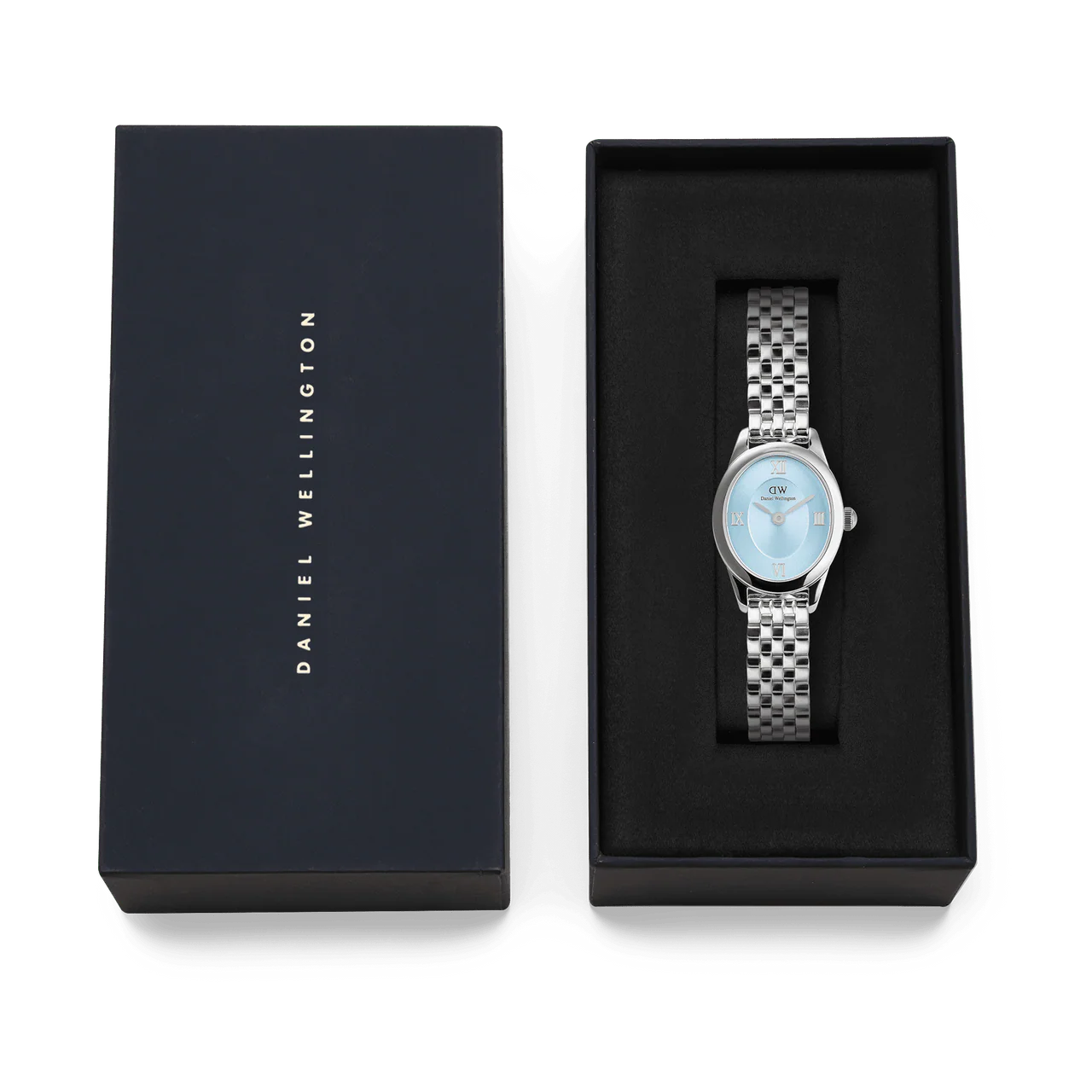 Graceful and refined, the Daniel Wellington Ophelia Mini Beans Link Ice Blue Dial Watch DW00100809 captures the essence of timeless femininity. This women’s watch features a serene ice blue dial framed in polished 316L stainless steel, harmonizing elegance with durability. The distinctive silver 5-link bracelet, designed with a beans link construction, offers a flexible and secure fit, enhancing its sophisticated profile. A petite 22mm case and minimalist Roman numeral markers create a delicate silhouette ideal for both everyday elegance and formal charm. Powered by reliable Japanese quartz movement and protected by a scratch-resistant mineral crystal, it ensures lasting performance. With water resistance up to 3 ATM and interchangeable strap functionality, this piece from the premium watches category balances style and versatility effortlessly—an exquisite choice for those who value precision, simplicity, and lasting beauty.