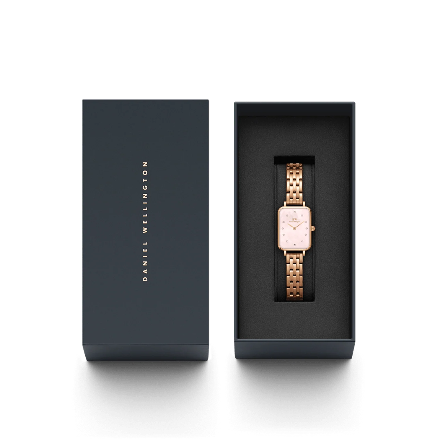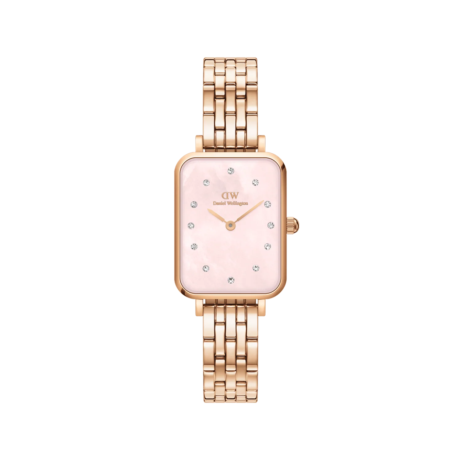 The Daniel Wellington Quadro Lumine 5-Link Melrose 20×26 Watch DW00100621 is a refined women’s watch that blends modern elegance with timeless detail. Crafted from double-plated rose gold stainless steel, its sleek rectangular 26 mm case frames a soft pink mother-of-pearl dial adorned with luminescent hands and crystal hour markers. The polished 5-link bracelet offers a comfortable fit and enduring sophistication, making it ideal for both casual elegance and formal charm.