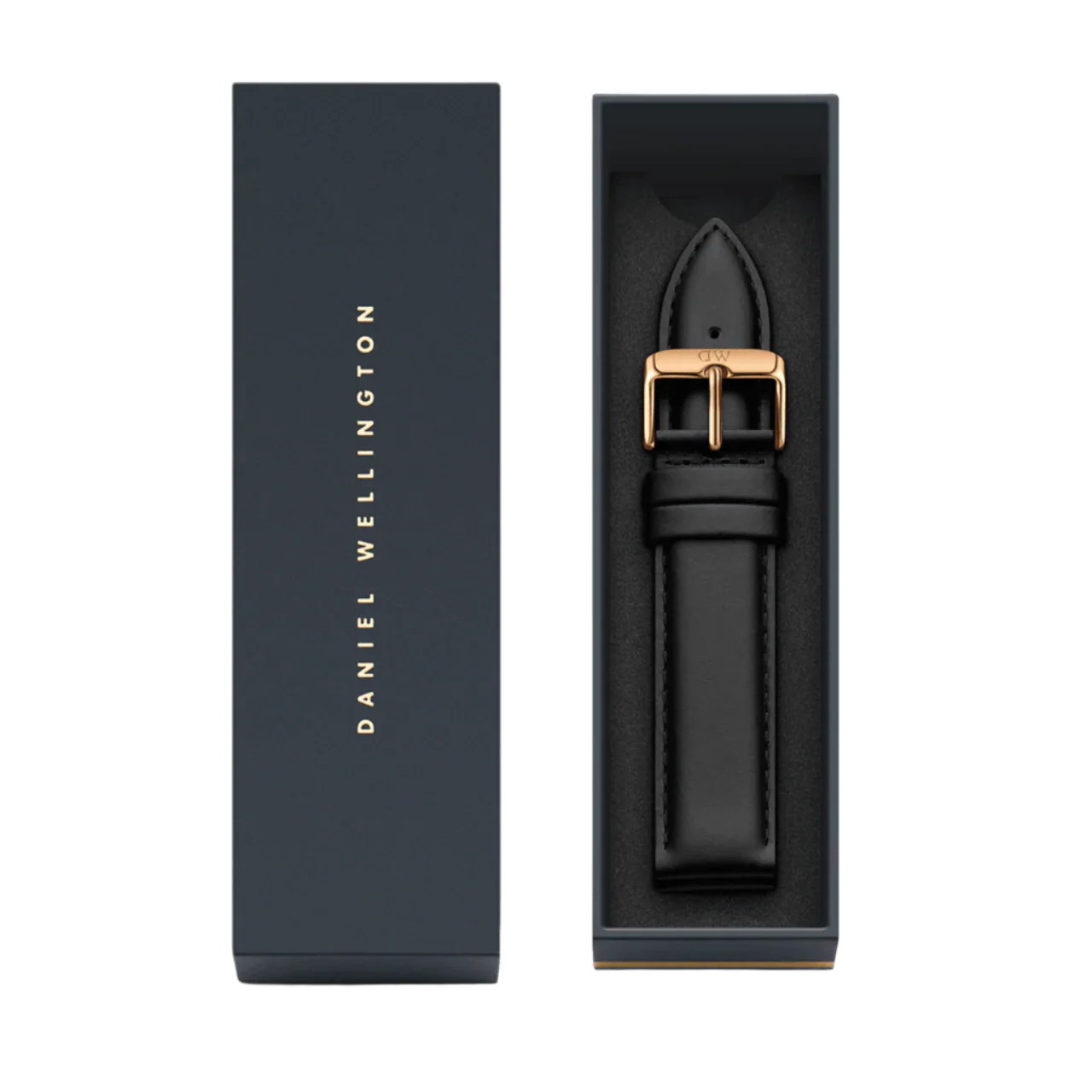Crafted from genuine leather, the Daniel Wellington Sheffield Strap in classic black blends refined simplicity with everyday sophistication. Designed to fit an 18mm case size, this elegant leather band features a polished rose gold buckle engraved with the iconic DW logo, offering a timeless complement to any Daniel Wellington timepiece. The smooth finish and clean stitching reflect the brand’s commitment to quality and detail, while the included Daniel Wellington box enhances its premium appeal. An ideal upgrade or replacement, this black leather watch strap is tailored for those who value understated luxury and versatile design in a men’s watch accessory.