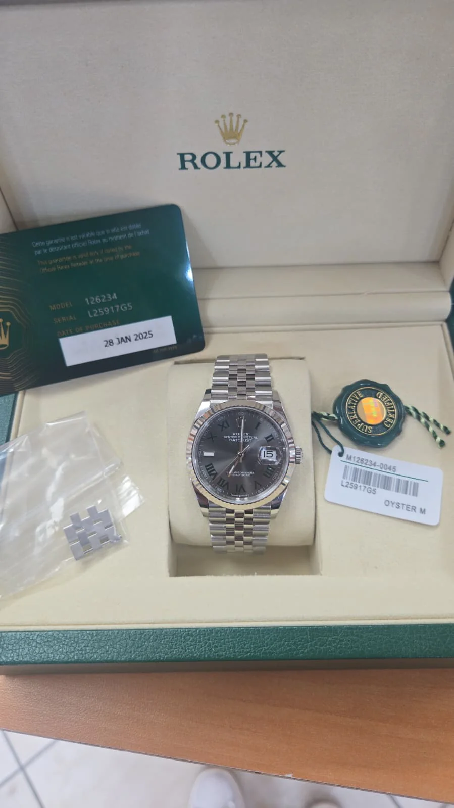 Rolex Date Just Modelo 126234 Serie #L259147G5 size 36″ full set year 2025
