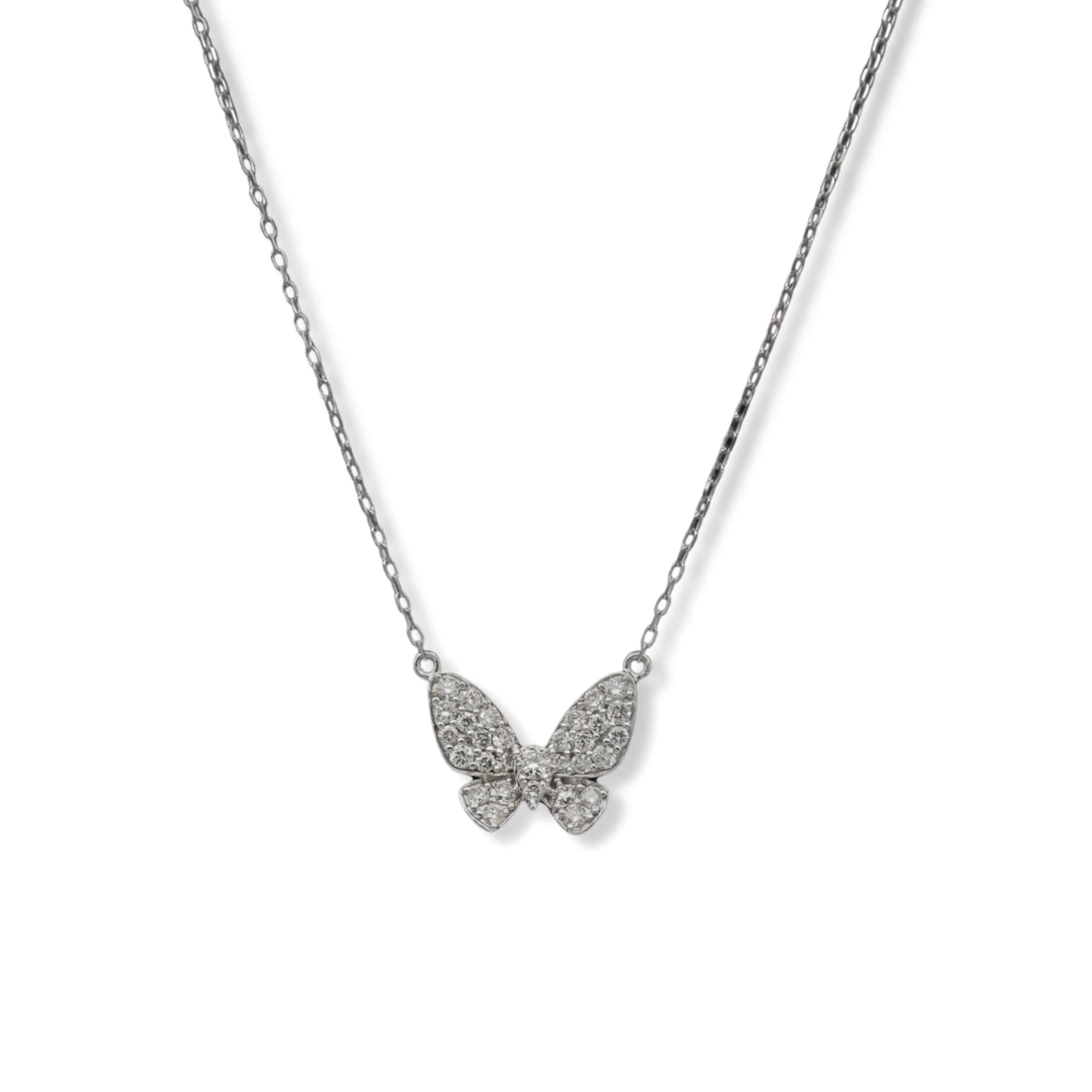 This exquisite Diamond Butterfly Charm Necklace is crafted in 18K white gold for an exquisite look. The beautiful necklace flaunts 1.9 grams of lustrous metal and radiant diamonds to evoke a sense of absolute elegance. Its 16-inch length makes it a perfect pick for formal and semi-formal occasions. Perfectly crafted to add an air of classic luxury to your look, it guarantees an aura of sophistication and grandeur.