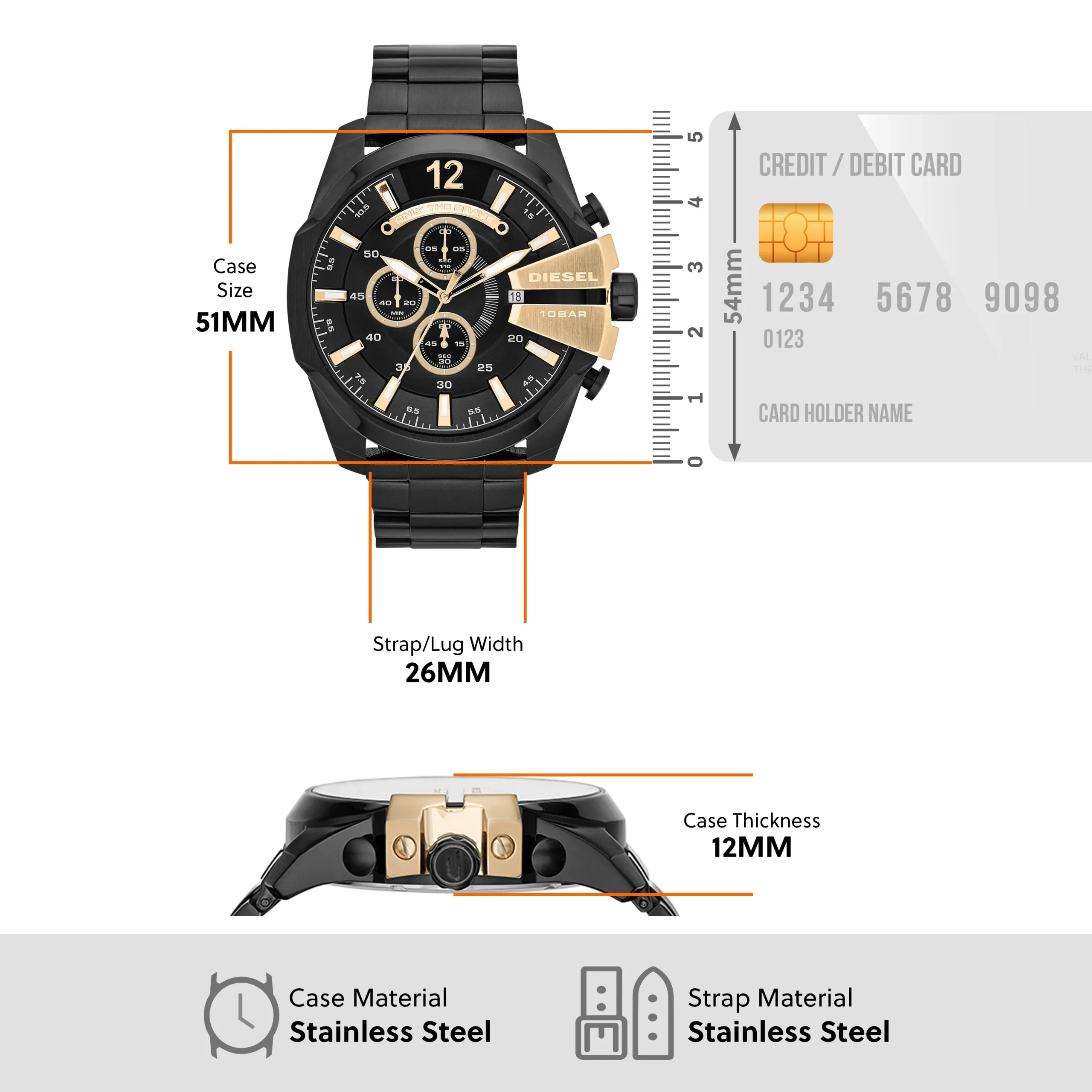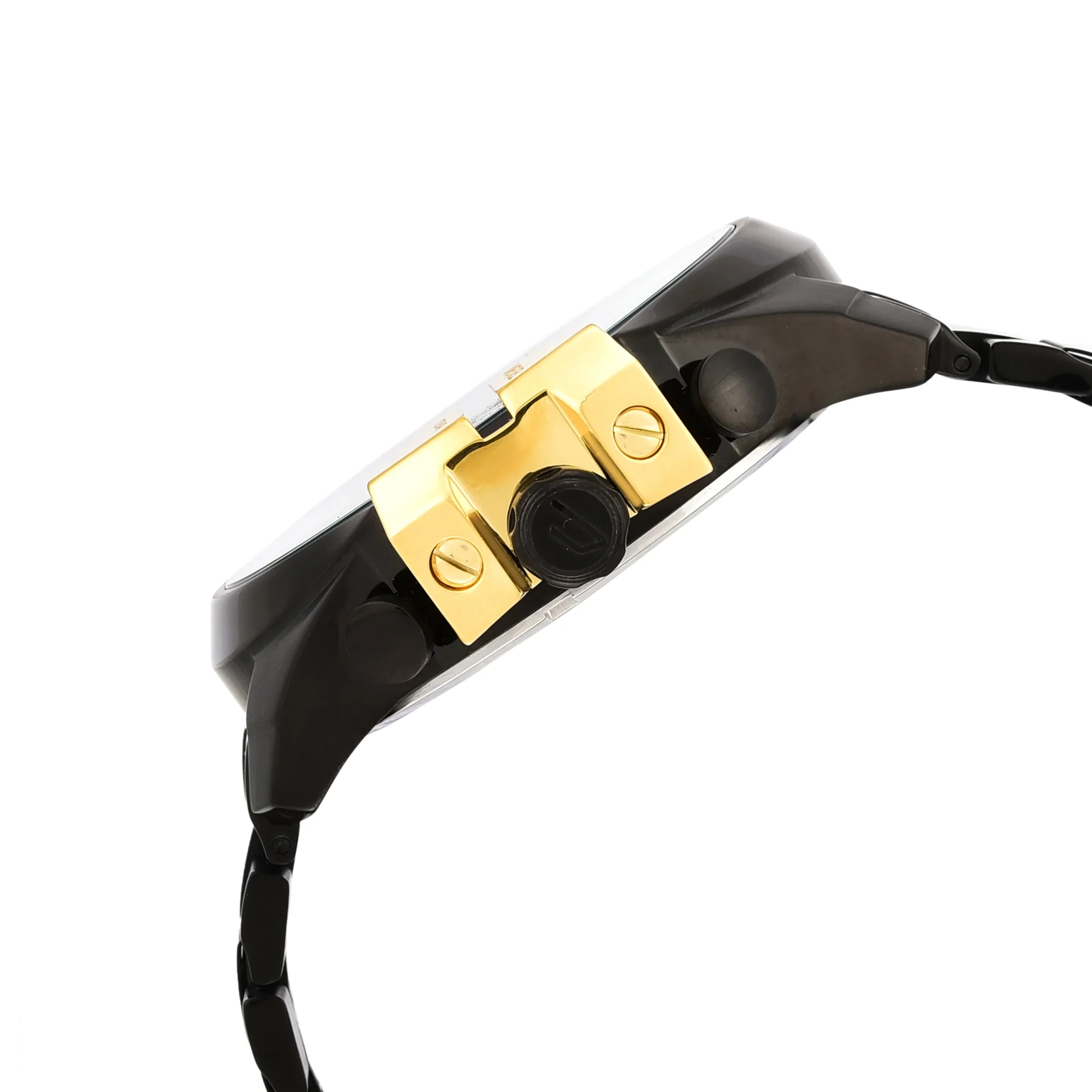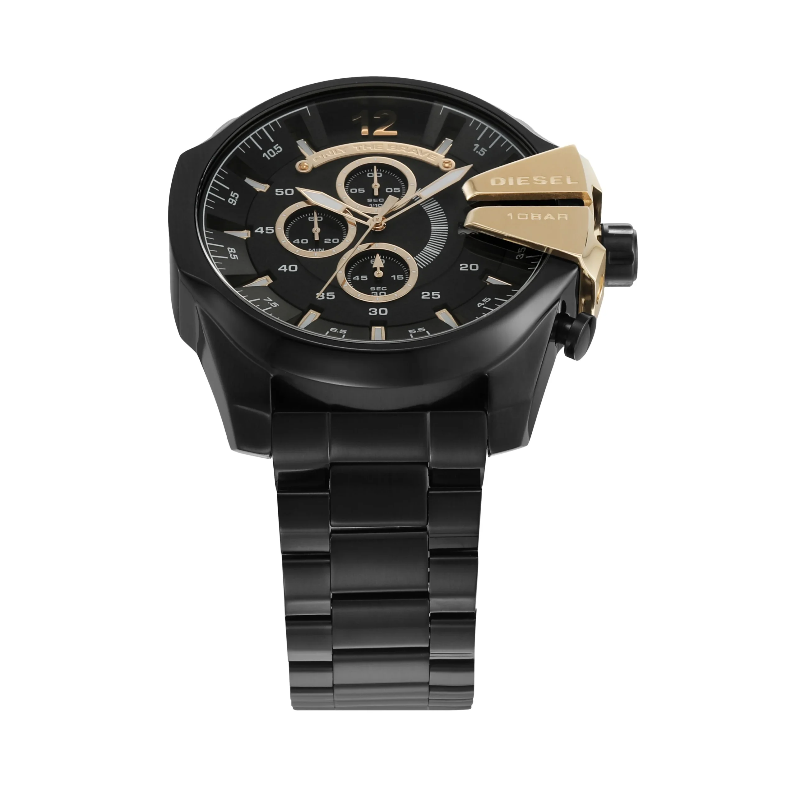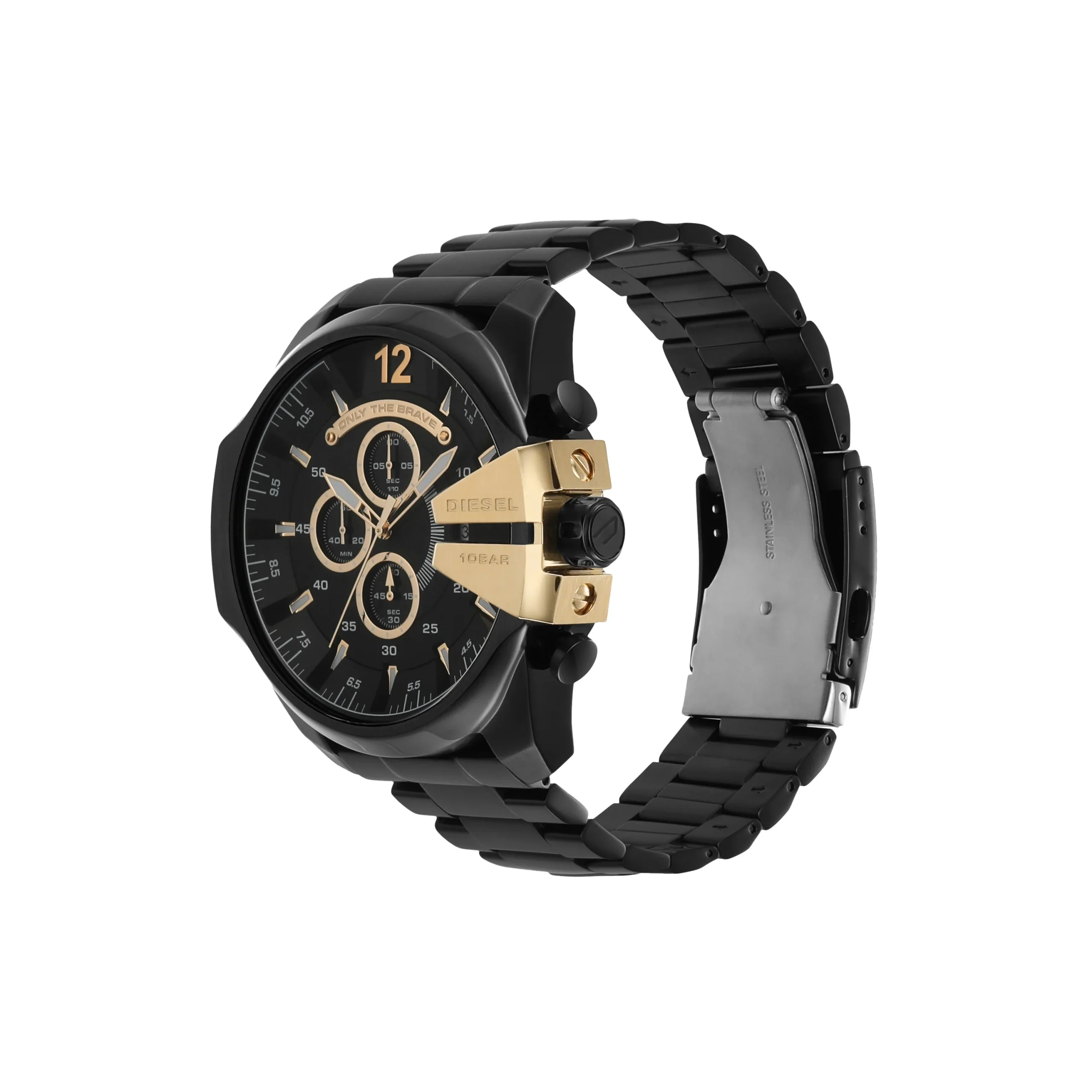 The Diesel Mega Chief Black Chronograph Stainless Steel Men’s Watch DZ4338 is a bold expression of modern masculinity. With a commanding 51mm black stainless steel case and matching bracelet, this timepiece blends industrial strength with sophisticated design. Gold-tone accents on the chronograph dial and crown guard elevate its sleek black finish, creating a refined contrast that stands out in any setting. Powered by precise quartz chronograph movement and protected by durable mineral glass, it offers both function and form. Water resistance up to 100 meters ensures reliability for everyday wear, while the bracelet deployant clasp adds secure comfort. Ideal for those who seek a men’s watch with both impactful design and dependable performance.