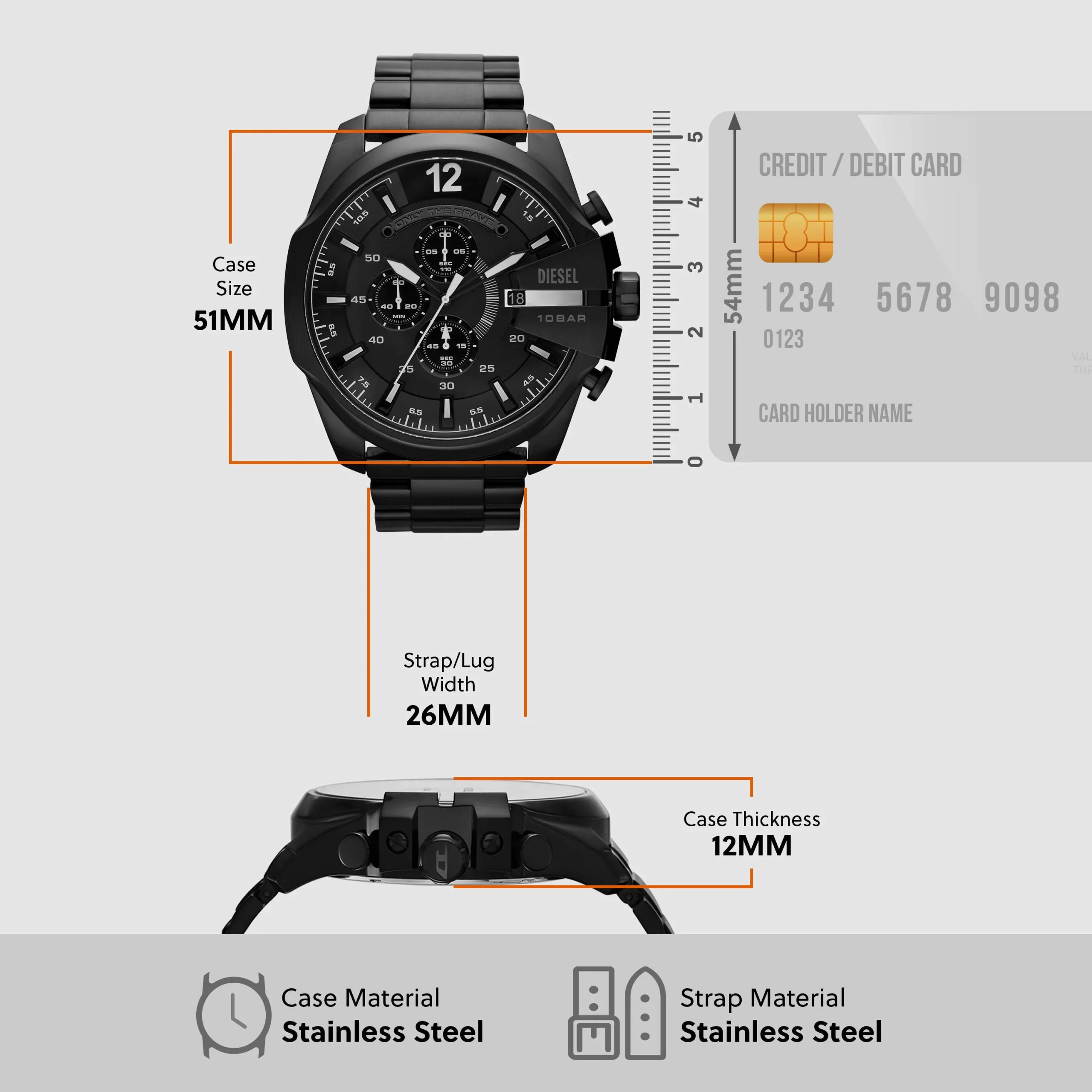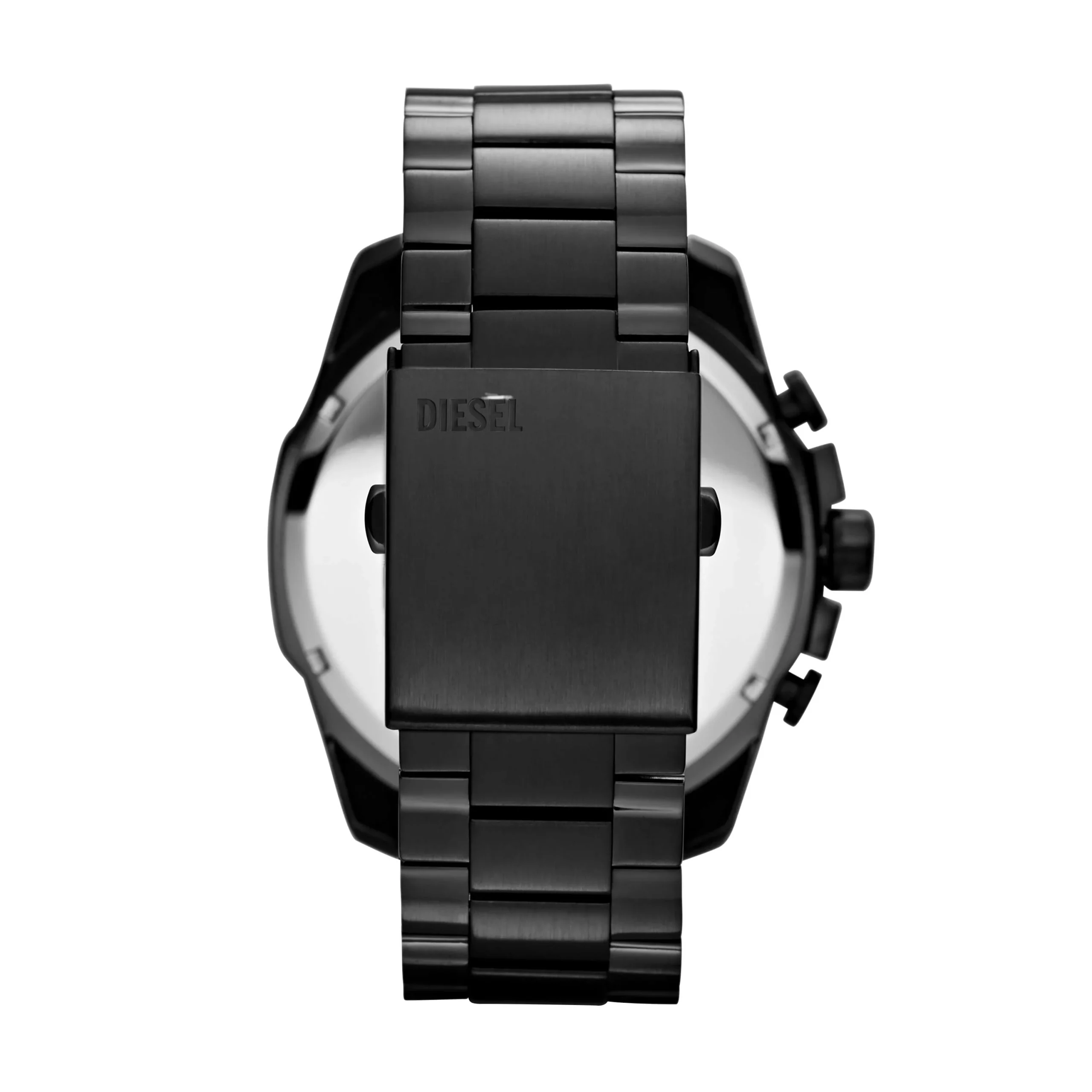 Striking in every detail, the Diesel Mega Chief Chronograph Black Stainless Steel Watch DZ4283 is a bold men’s watch designed for those who command attention. The 51mm black stainless steel case and bracelet create a powerful presence, while the matte black dial with high-contrast chronograph subdials and date display offers both functionality and depth. Built with a durable mineral glass face and water resistance up to 100 meters, it’s crafted for resilience as much as style. The quartz chronograph movement ensures precision, and the bracelet deployant clasp delivers a secure, comfortable fit. With its commanding design and refined engineering, this timepiece effortlessly merges modern masculinity with everyday performance.