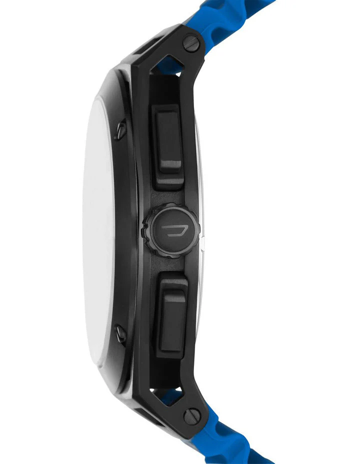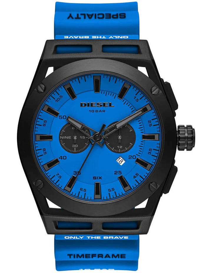 Designed in stainless steel and silicone, this vibrant chronograph features the brand signature line “only the brave” on its neon blue strap. The large matte black case nestles a blue dial with black accents to balance the style.