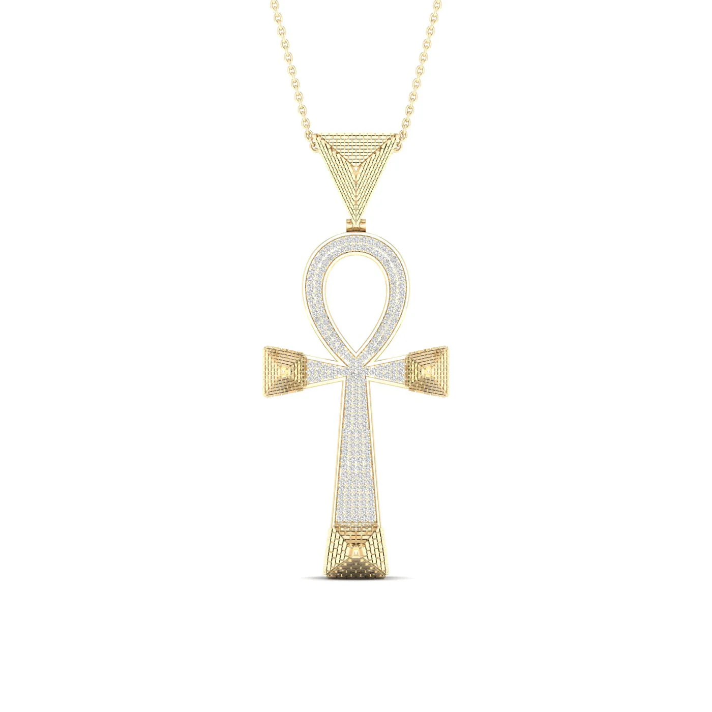 Elevate your style with the opulence of ancient symbols and modern design in our Dazzling 10K Yellow Gold Diamond Ankh Men’s Pendant. Encrusted with 0.50 carats of H – I color and I1 – I2 clarity diamonds, this pendant offers a contemporary spin on the timeless Egyptian Ankh, representing eternal life and vitality. Each diamond is strategically set to enhance the pendant’s majestic radiance, making it a standout piece for the discerning gentleman.