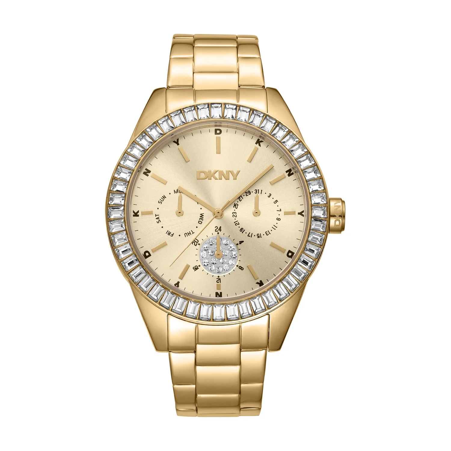 The DKNY Nolita Multi Glitz Champagne Dial Stainless Steel Watch DK1L027M0045 is a stunning embodiment of elegance and modern sophistication, perfect for the discerning woman. With its radiant champagne dial and luxurious gold-toned stainless steel band, this women’s watch effortlessly complements any outfit, from casual to formal. The meticulous craftsmanship features a 40mm stainless steel case adorned with crystal embellishments, adding a touch of glamour. Designed for practicality, it boasts water resistance up to 50 meters and reliable quartz movement for precise timekeeping. The secure fold-over clasp ensures a comfortable fit, making it an ideal choice for daily wear. Elevate your accessory collection with this exquisite timepiece that marries style and functionality, making every moment a celebration of modern elegance.