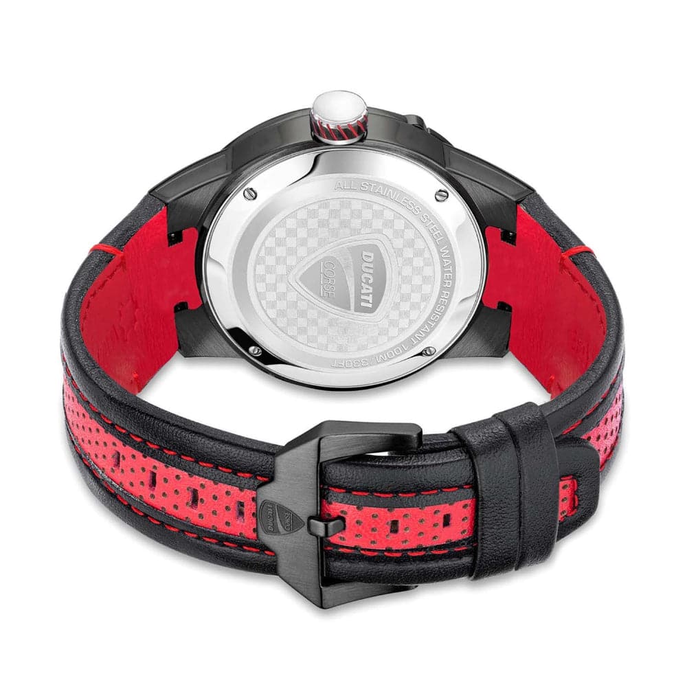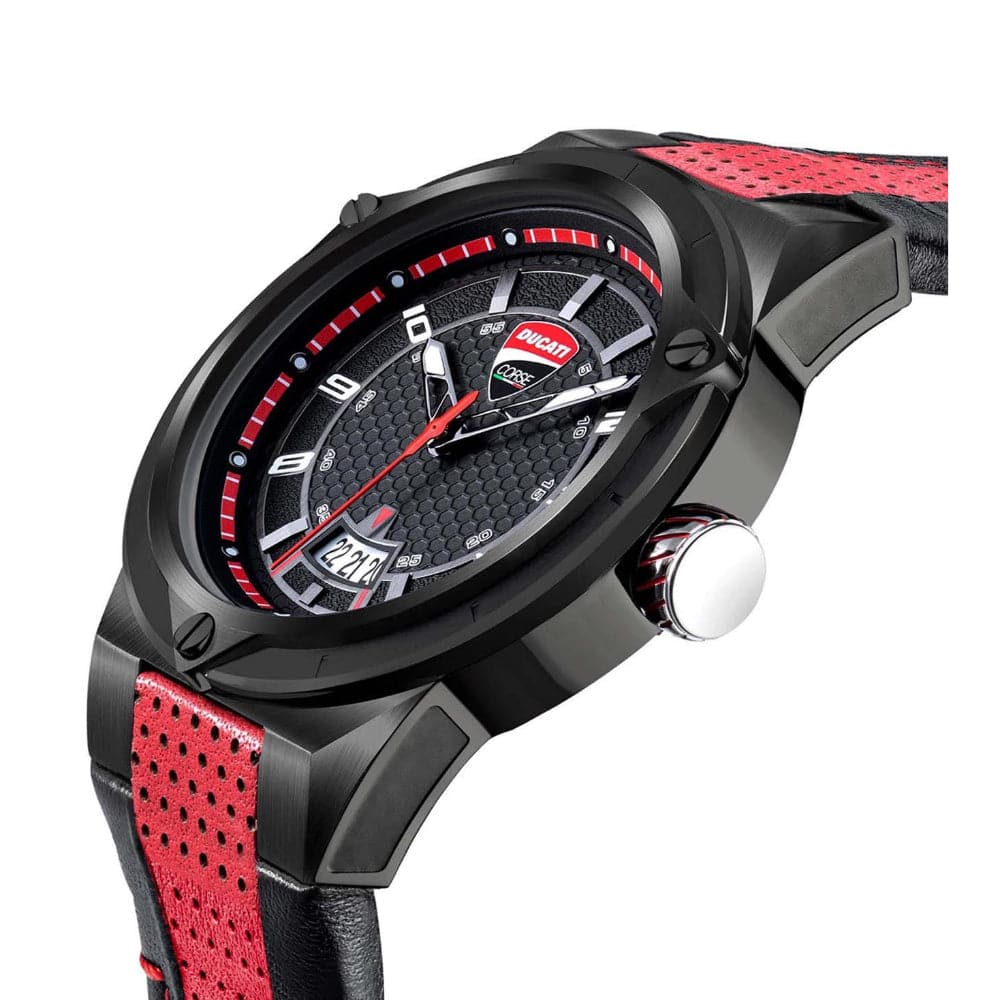 Ducati brand is brought alive in this watch by using the iconic Ducati Corse Shield logo at a prominent position on the dial and also etching the word ‘Ducati’ on the case of the watch. Ducati as a brand stands for racing and is a fierce and successful competitor in the racing circuits of the world. This inspiration is brought alive in the curved, smooth design of the watch’s case and with the use of a carbon fibre dial.