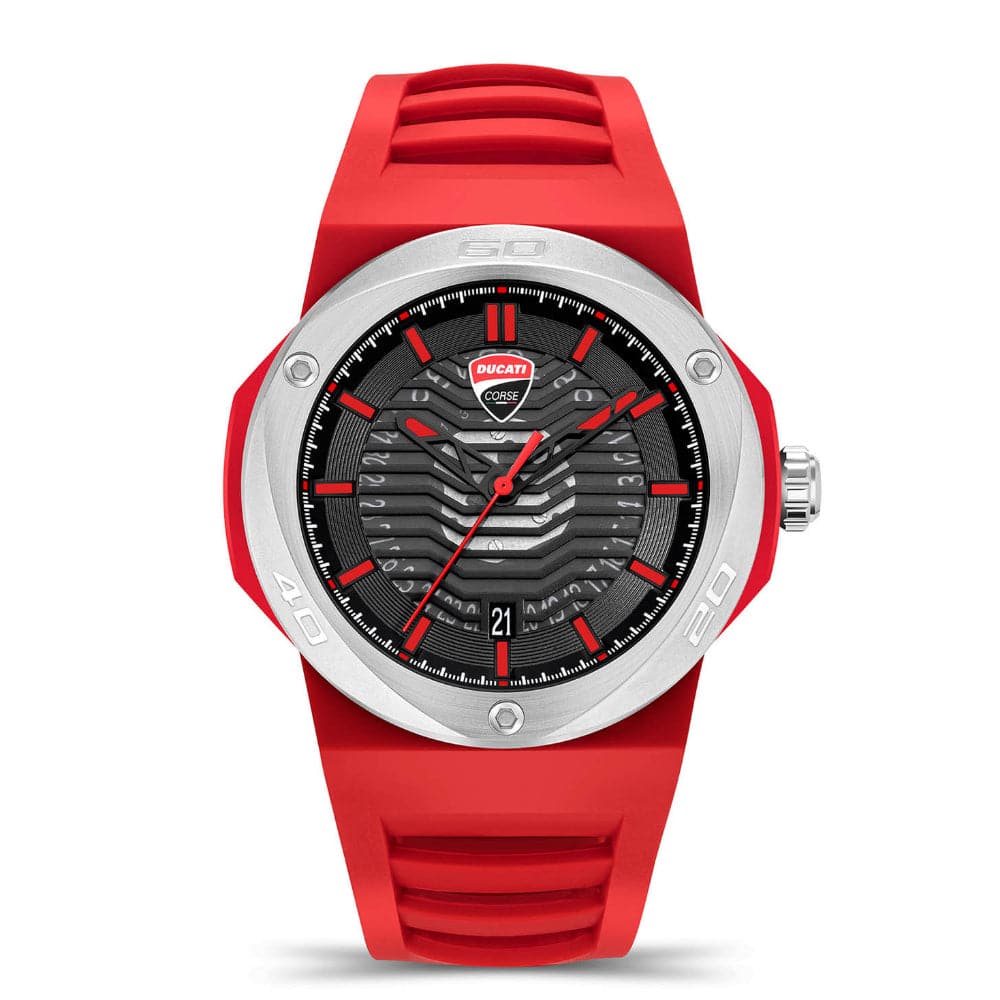 The most powerful watch in Ducati’s history with a design reflecting your true racing spirit. It features a black sunray dial with a date window and a stylish silicone strap. With 100 m water resistance, this watch has all the features of a race-ready timepiece.