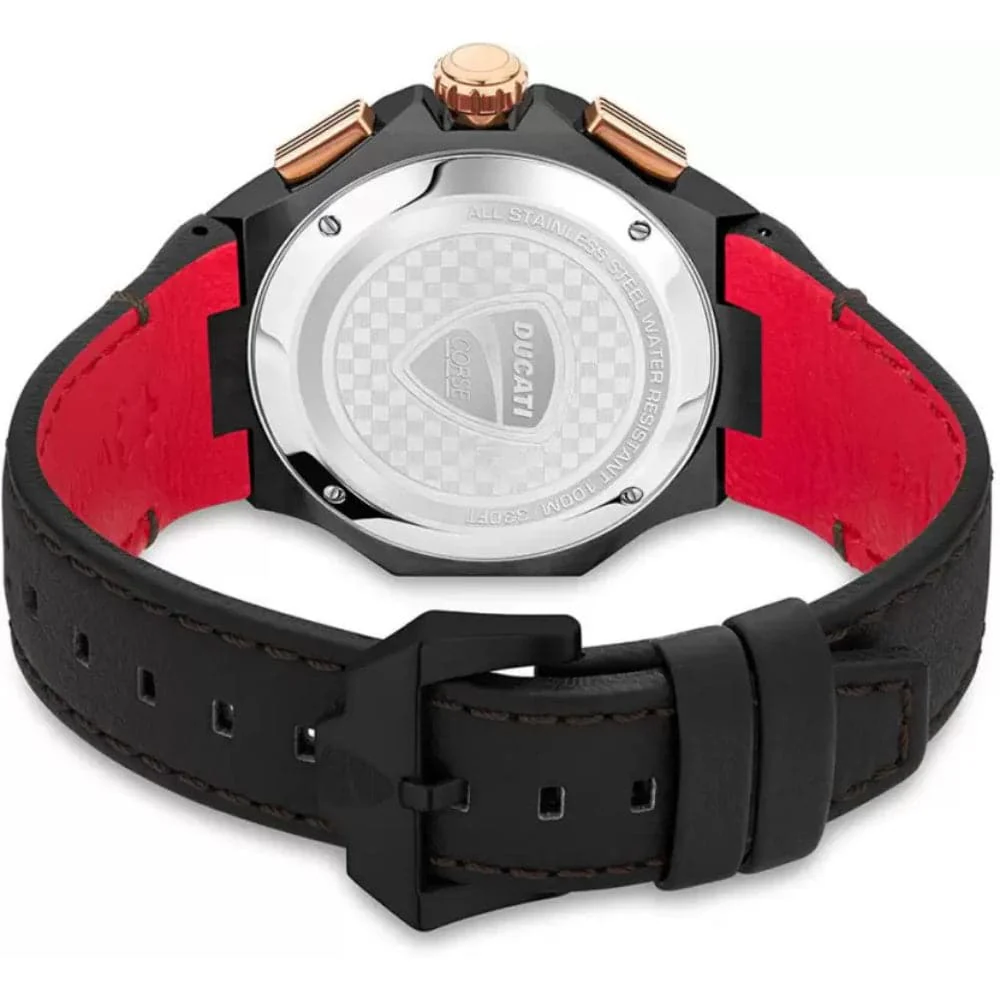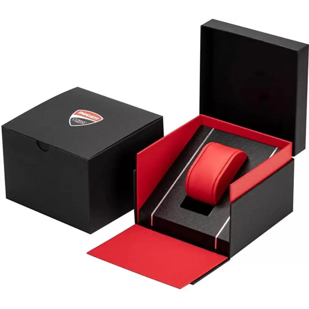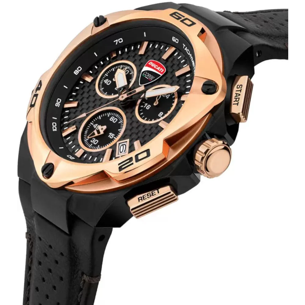 Ducati Corse brand is brought alive in the watches by using the iconic Ducati Shield (Logo) at a prominent position on the dial and also etching the word ‘DUCATI CORSE’ on the case of the watch. Ducati as a brand stands for racing and is a fierce and successful competitor in the racing circuits of the world. This inspiration is brought alive in the curved, smooth design of the case and with the use of carbon fibre dials.
