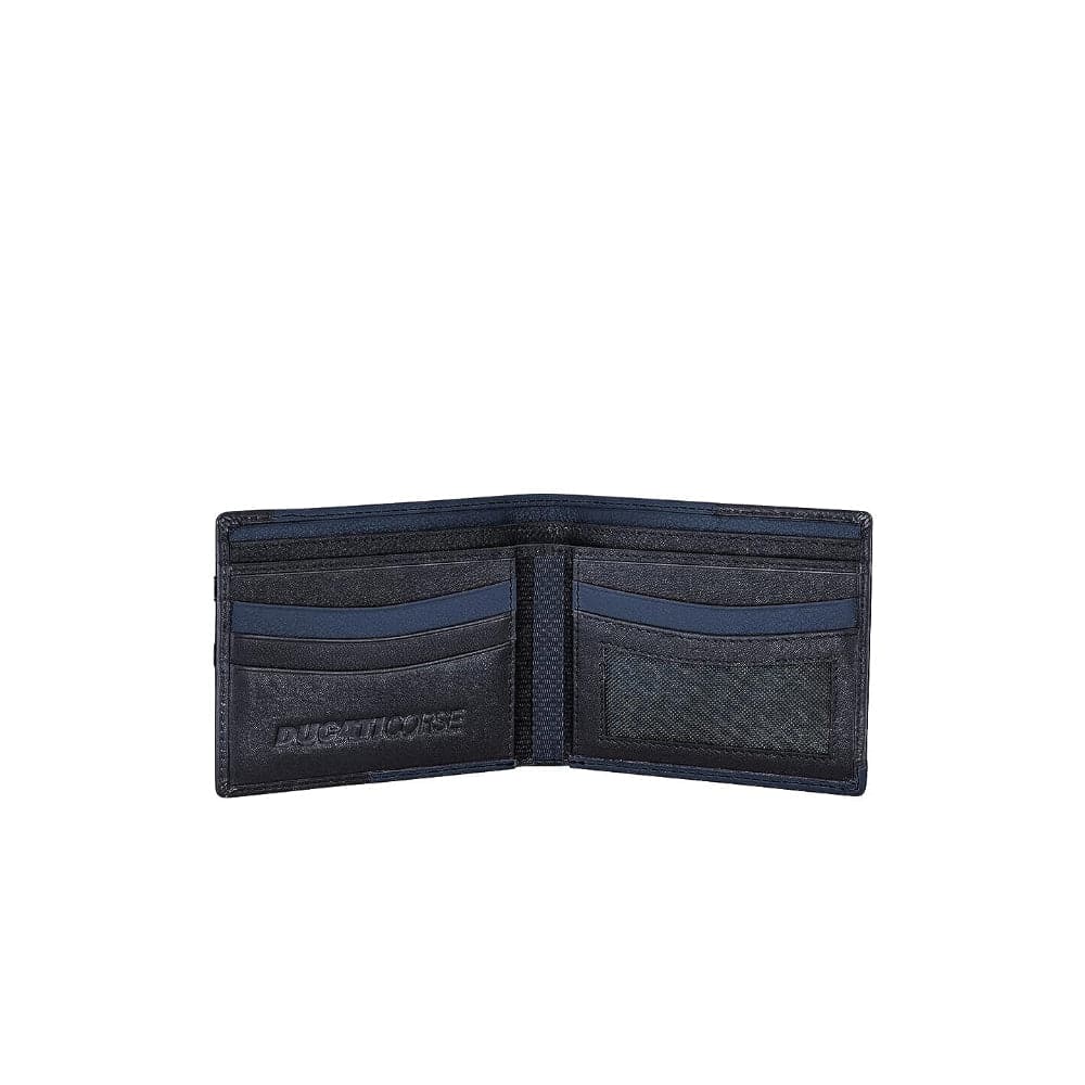 Modena Wallet. 100% blue & black leather. White Ducati Corse logo printed and black tone on tone Ducati lettering stitched.